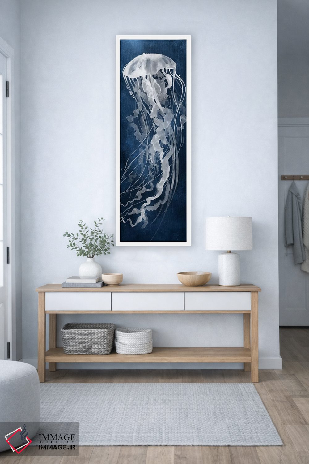 براساس پالت سرد اثر، قاب سفید مات (فریم باریک) پیشنهاد اول است و نقرهای برسخورده (متالیک) مکمل. برای سفارشهای پروژهای با ابعاد و قابهای اختصاصی با ایماژ در تماس باشید.
