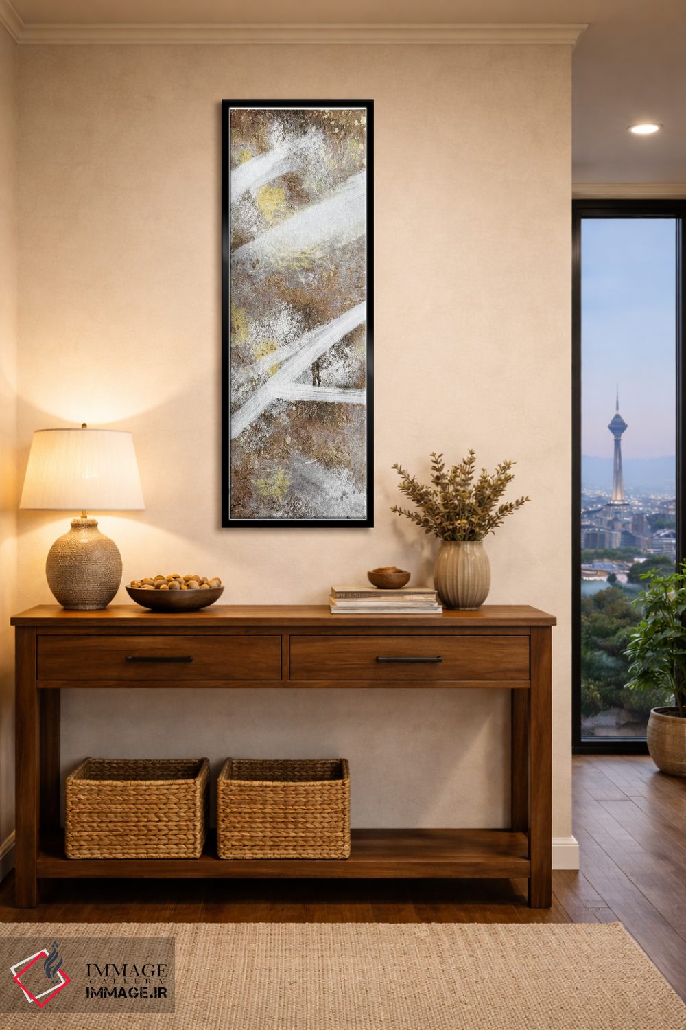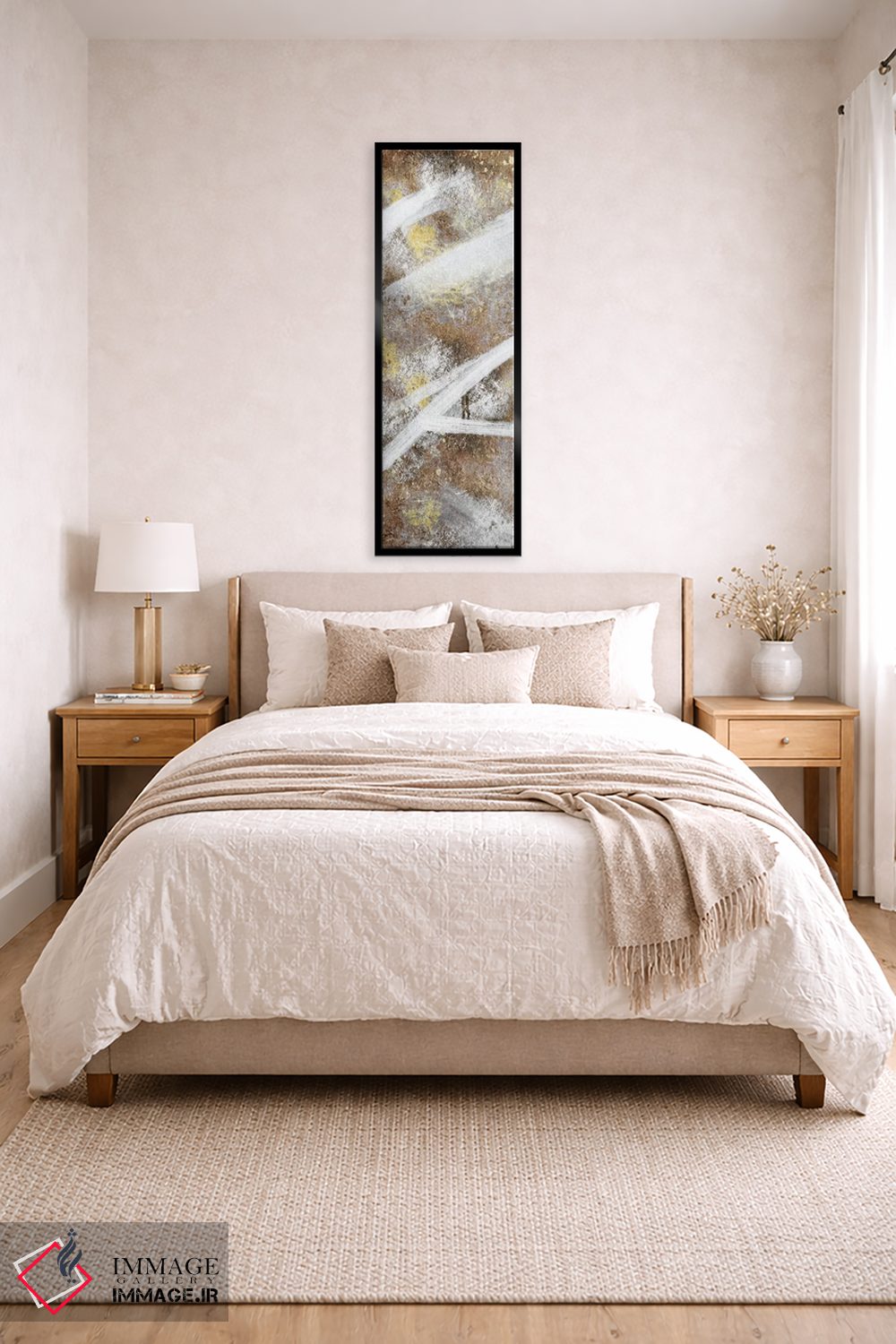 براساس پالت گرم اثر، قاب بلوط روشن (چوبی) پیشنهاد اول است و استخوانی ملایم مکمل. برای سفارشهای پروژهای با ابعاد و قابهای اختصاصی با ایماژ در تماس باشید.