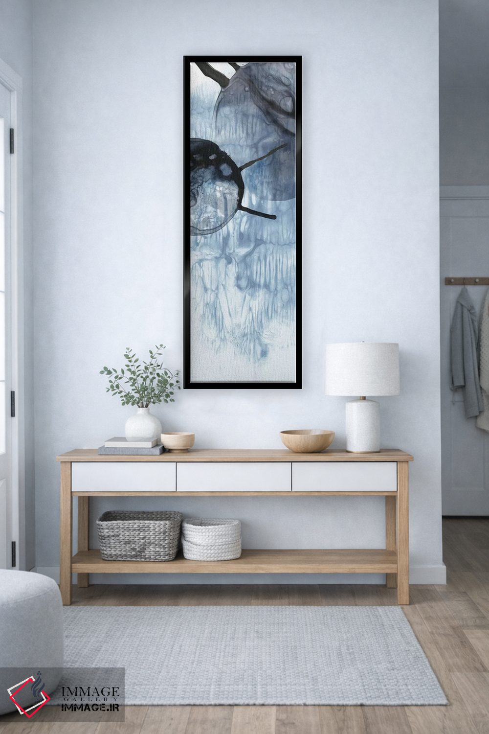 براساس پالت سرد اثر، قاب سفید مات (فریم باریک) پیشنهاد اول است و نقرهای برسخورده (متالیک) مکمل. برای سفارشهای پروژهای با ابعاد و قابهای اختصاصی با ایماژ در تماس باشید.