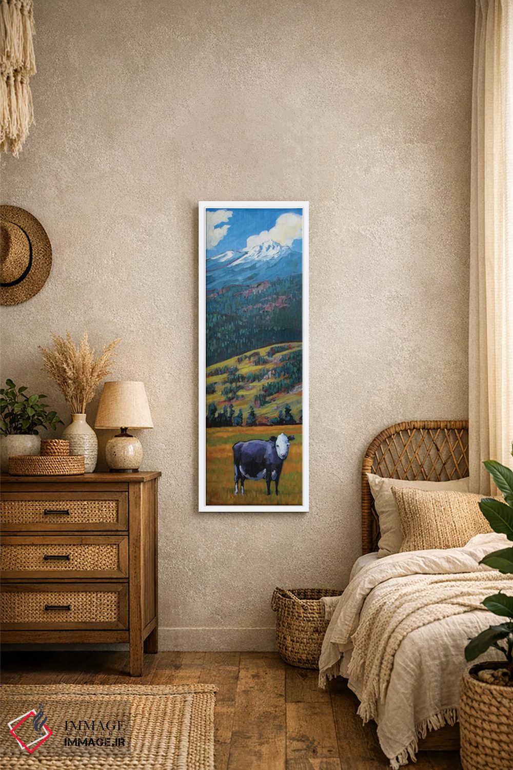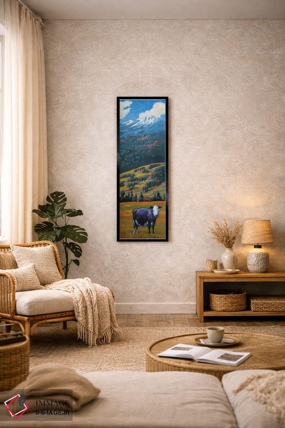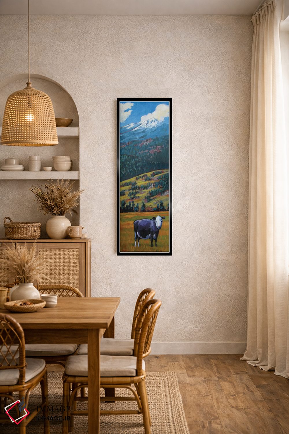 اگر میخواهید دیوار کمی سرزندگیِ محترمانه داشته باشد، «گاو تنها در دره سنخوان» اثرِ «پتی بیکر» مثل یک امضای بامزه اما متین عمل میکند، برای فضاهای روستیک یا بوهو گزینهٔ مناسبیست. در کنار گیاهان و نور طبیعی، جذابتر هم میشود.