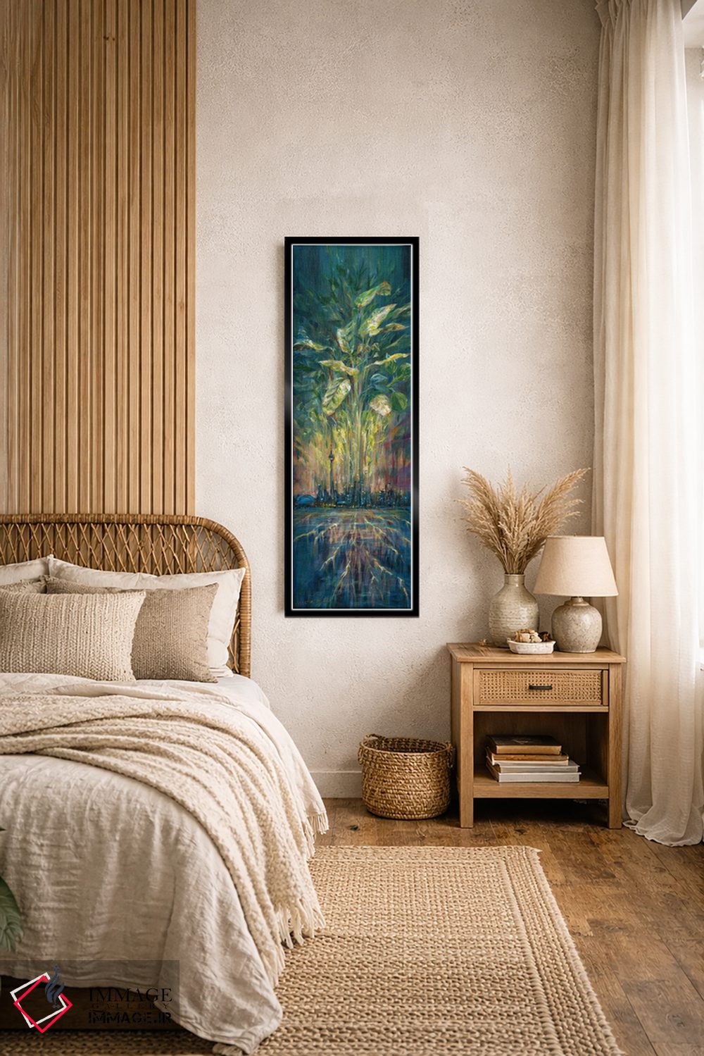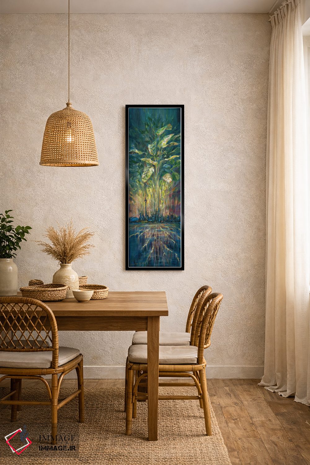 براساس پالت ترکیبی اثر، قاب تیک گرم (چوبی) پیشنهاد اول است و مشکی مات (فریم متوسط) مکمل. برای سفارشهای پروژهای با ابعاد و قابهای اختصاصی با ایماژ در تماس باشید.