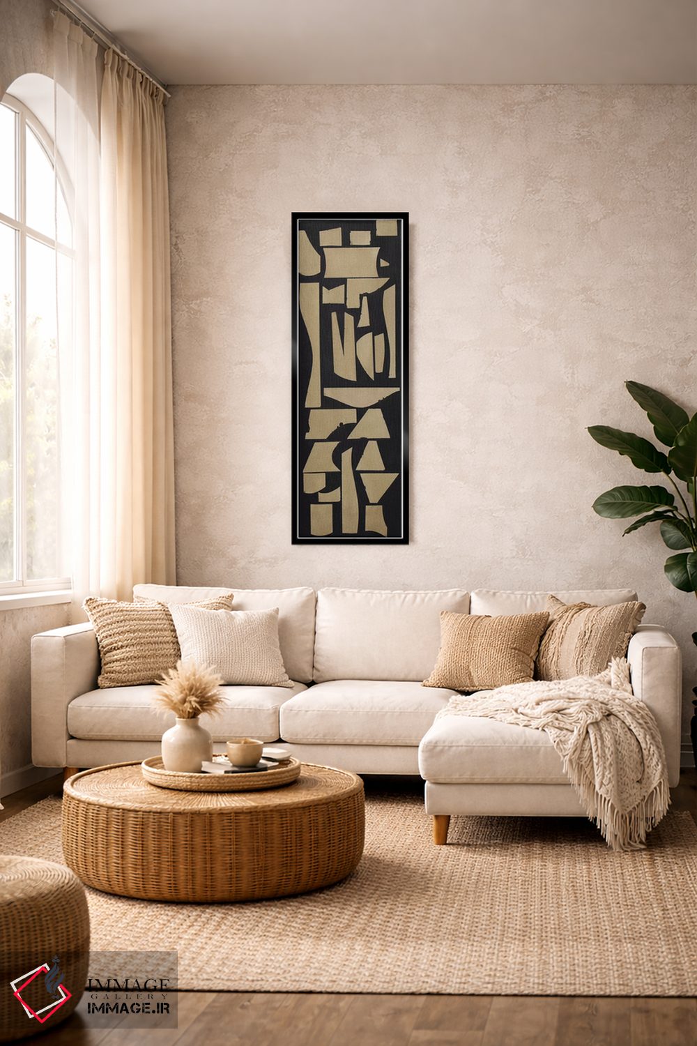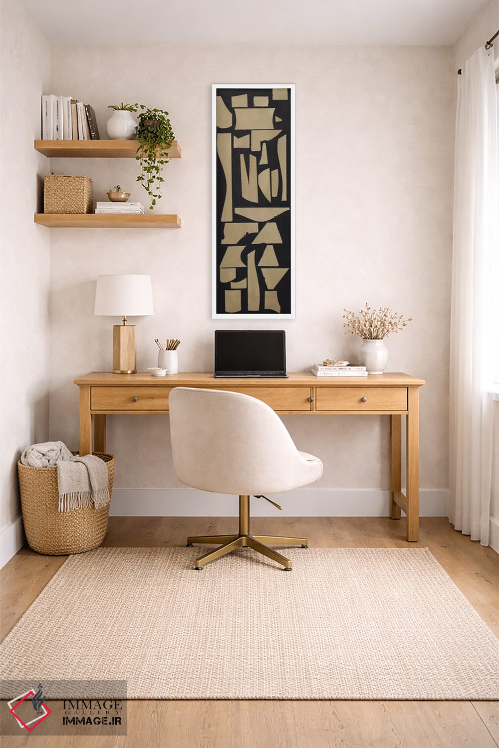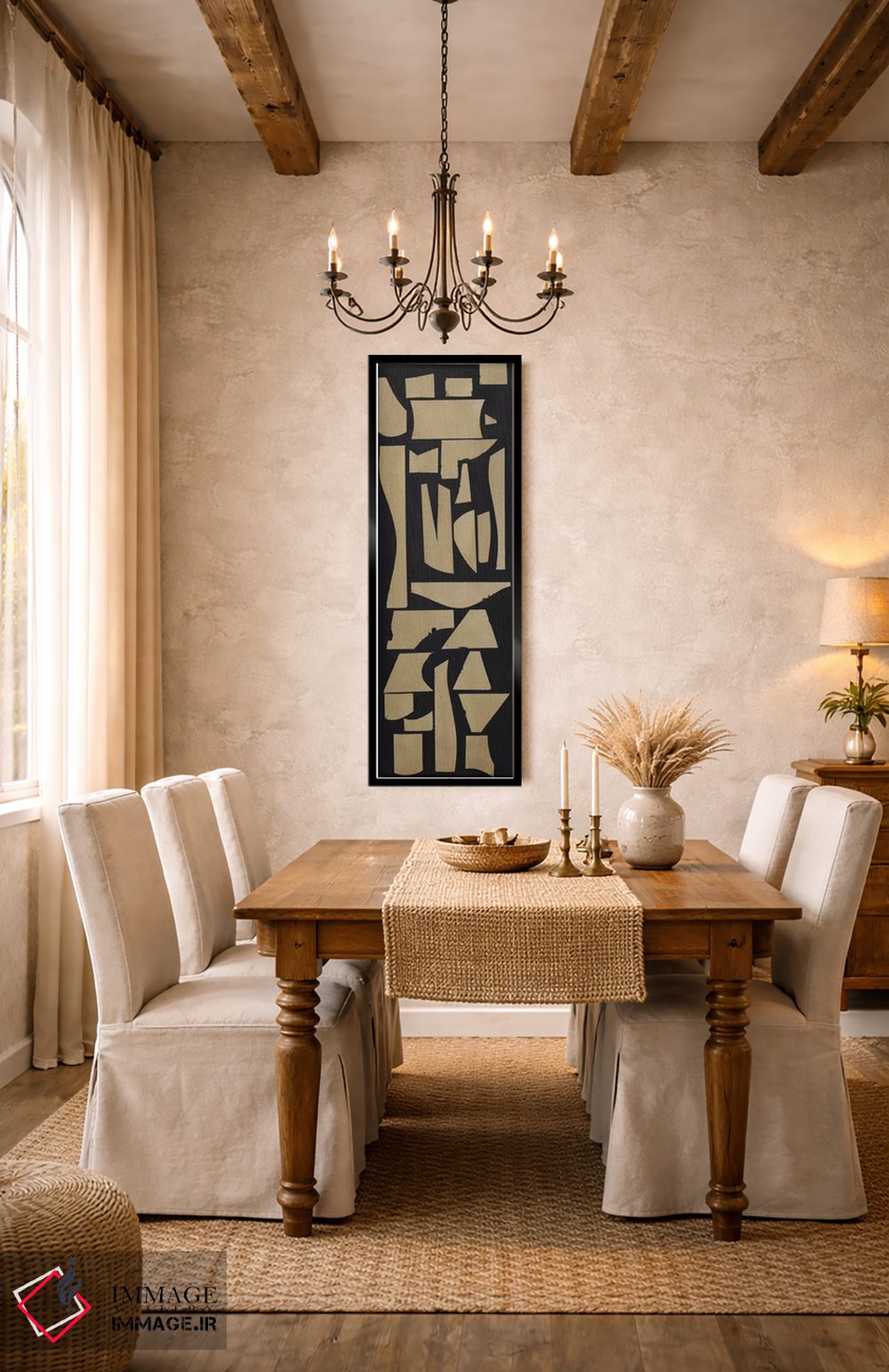 براساس پالت گرم اثر، قاب بلوط روشن (چوبی) پیشنهاد اول است و استخوانی ملایم مکمل. برای سفارشهای پروژهای با ابعاد و قابهای اختصاصی با ایماژ در تماس باشید.