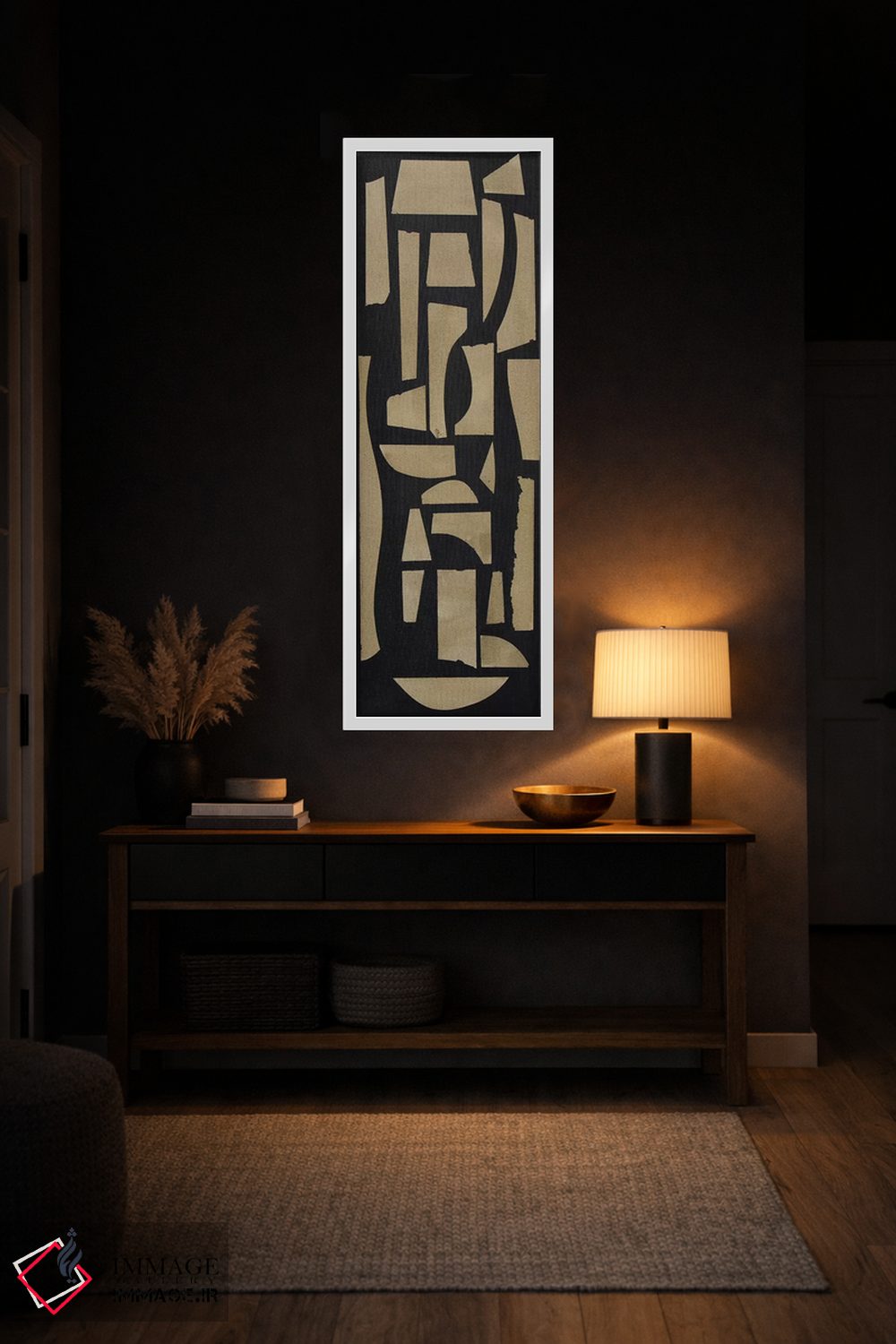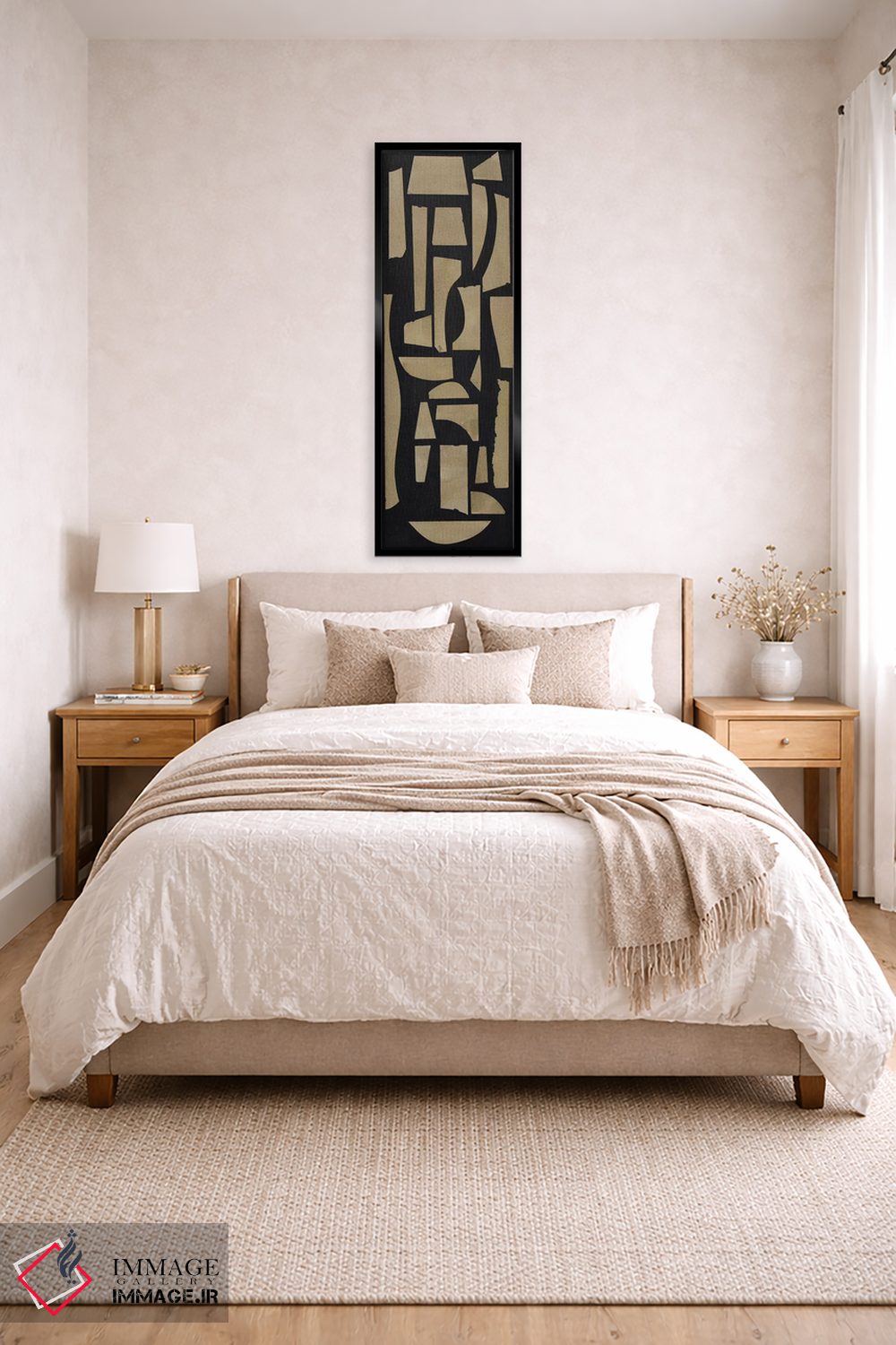 براساس پالت گرم اثر، قاب بلوط روشن (چوبی) پیشنهاد اول است و استخوانی ملایم مکمل. برای سفارشهای پروژهای با ابعاد و قابهای اختصاصی با ایماژ در تماس باشید.