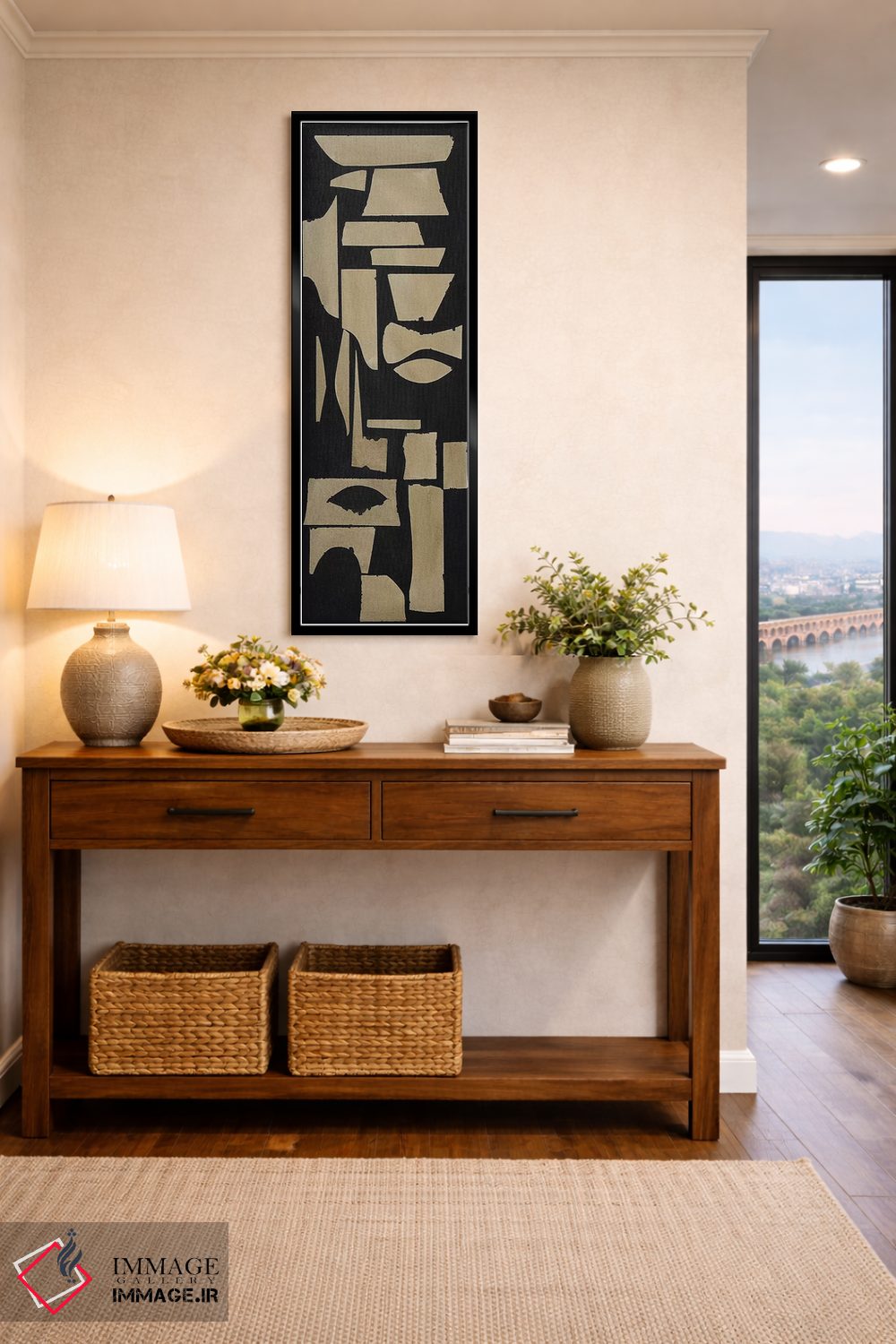 براساس پالت گرم اثر، قاب بلوط روشن (چوبی) پیشنهاد اول است و استخوانی ملایم مکمل. برای سفارشهای پروژهای با ابعاد و قابهای اختصاصی با ایماژ در تماس باشید.