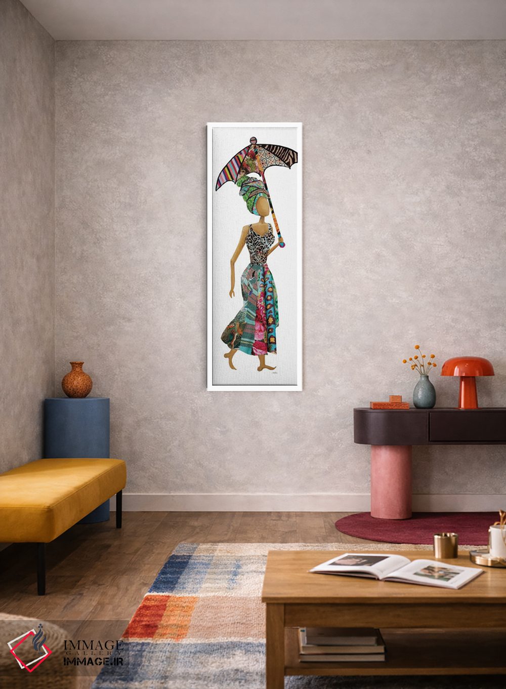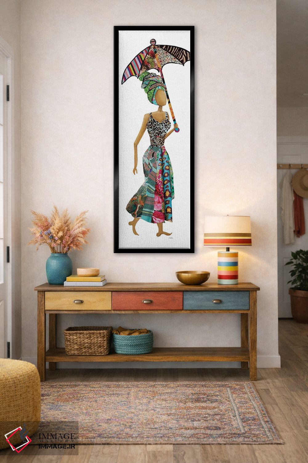 «زن ژوزا با چتر (Xhosa: قوم آفریقایی)» اثرِ «جینا ریتر» یک قاب دکوراتیوِ گرم و دلنشین است؛ این اثر در اجرای پرداختِ هنری، فضا را نرمتر و صمیمیتر نشان میدهد.