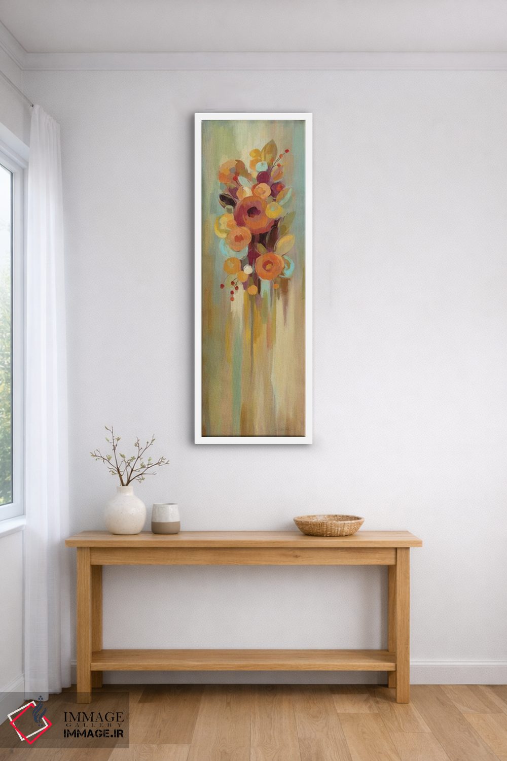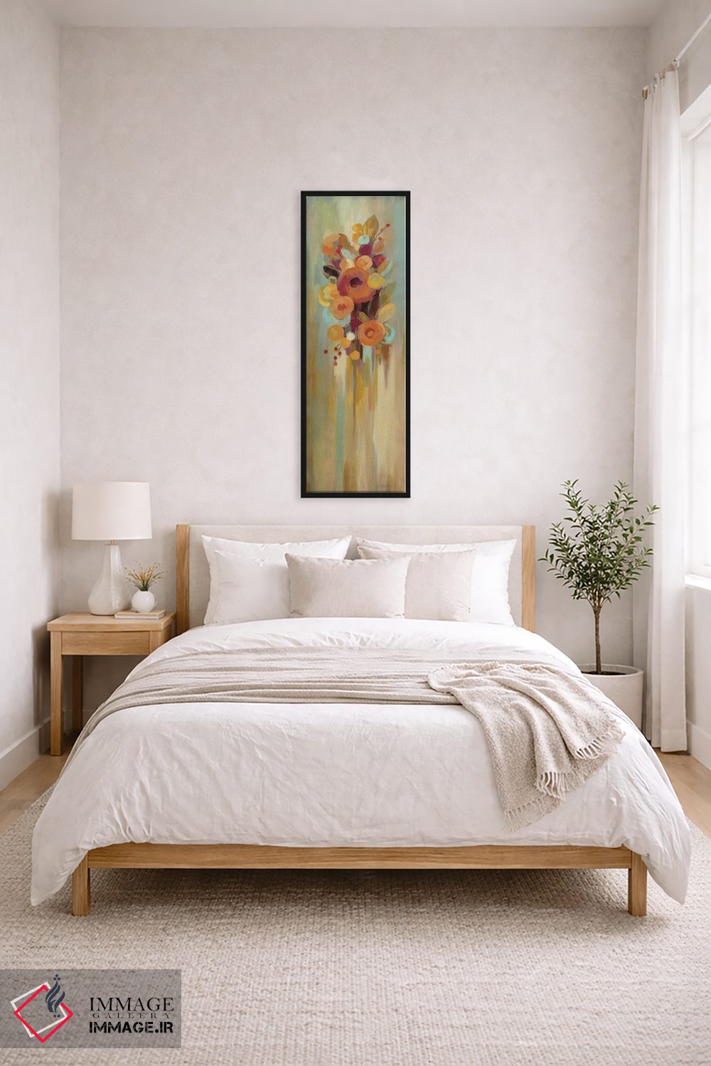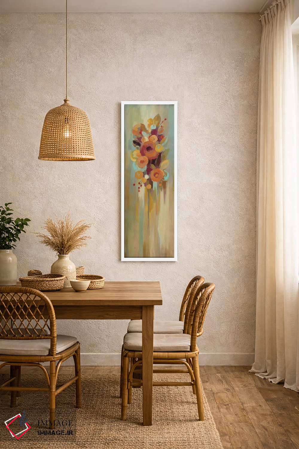 براساس پالت گرم اثر، قاب بلوط روشن (چوبی) پیشنهاد اول است و استخوانی ملایم مکمل. برای سفارشهای پروژهای با ابعاد و قابهای اختصاصی با ایماژ در تماس باشید.