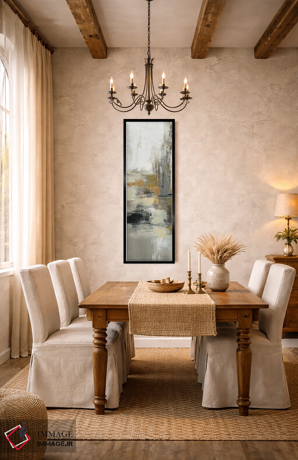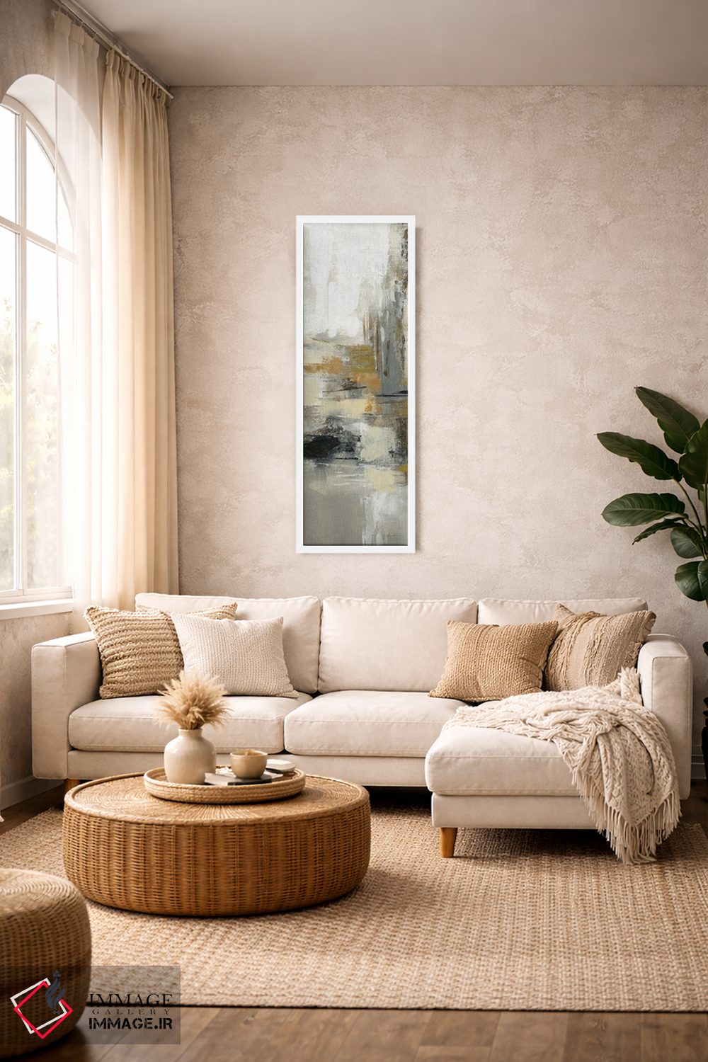 براساس پالت گرم اثر، قاب بلوط روشن (چوبی) پیشنهاد اول است و استخوانی ملایم مکمل. برای سفارشهای پروژهای با ابعاد و قابهای اختصاصی با ایماژ در تماس باشید.