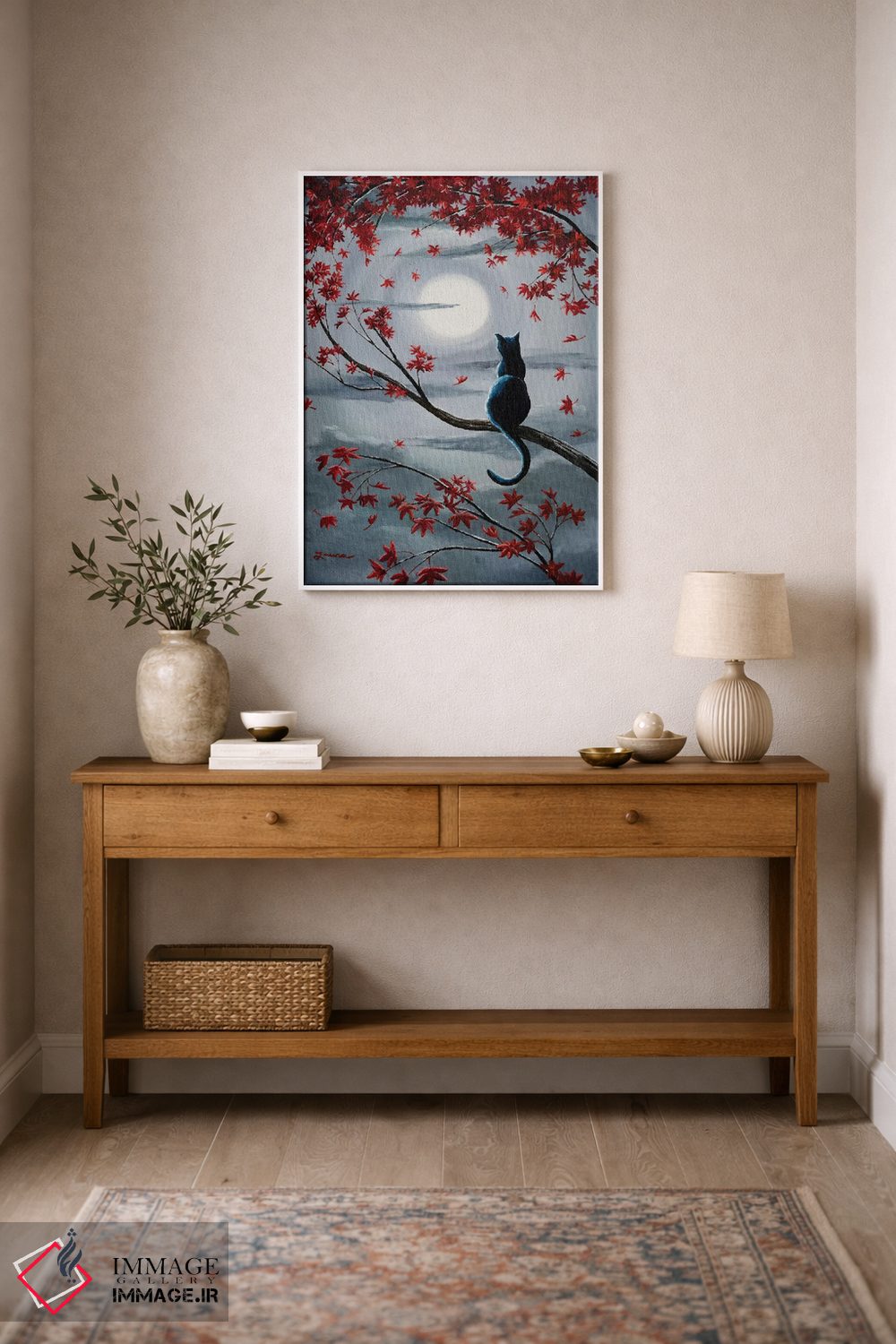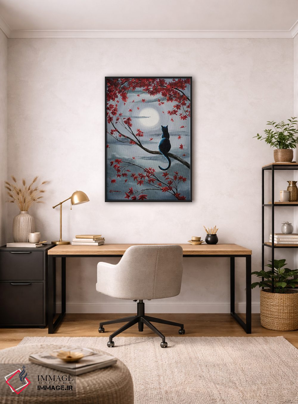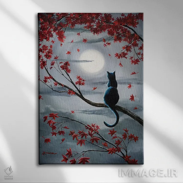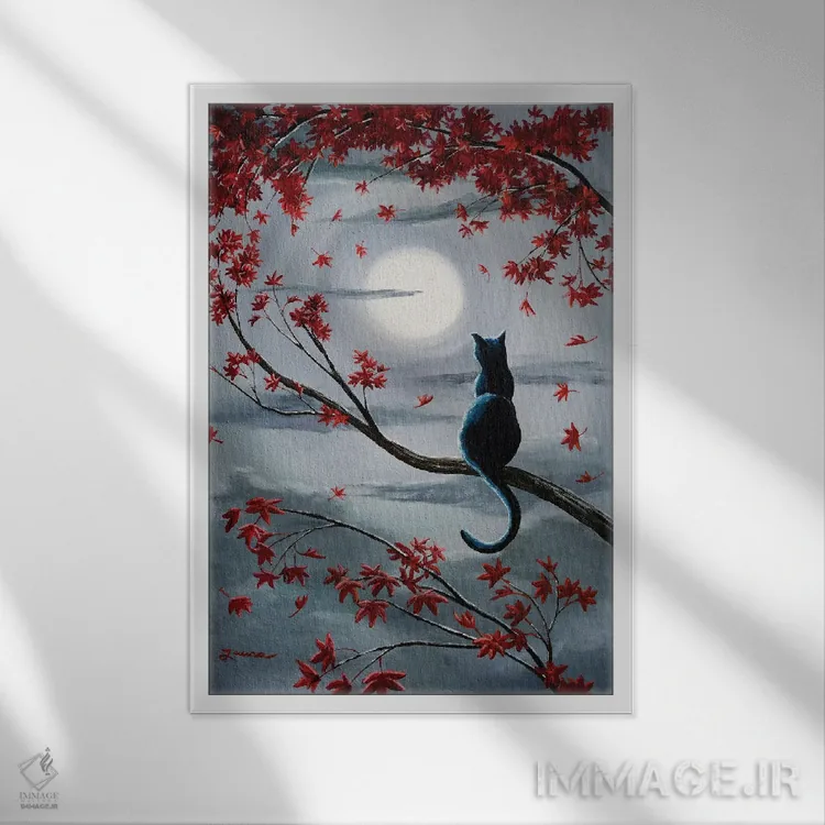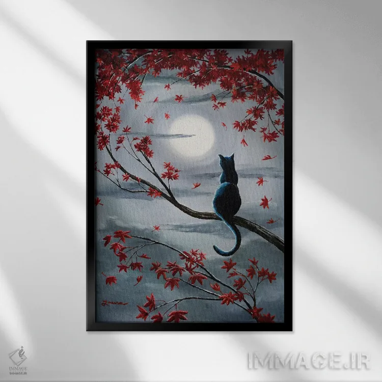«گربه سیاه در نور ماه نقرهای» اثرِ «لورا ایورسن» میتواند به دیوار، انرژیِ نرم و زنده بدهد؛ برای راهروها و ورودیهای گرم پیشنهاد میشود. هر بار نگاهش میکنید، یک جزئیات تازه به چشم میآید.