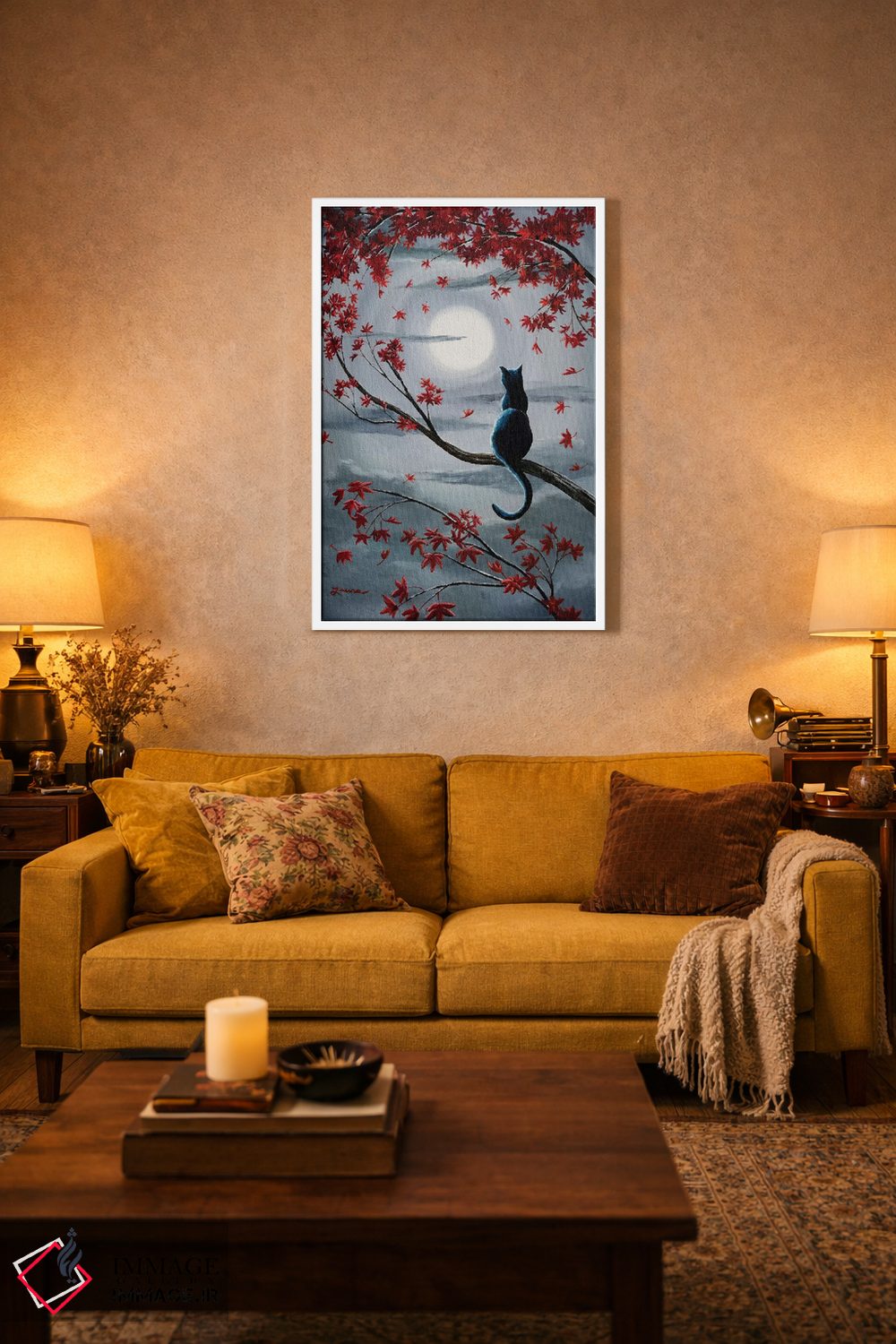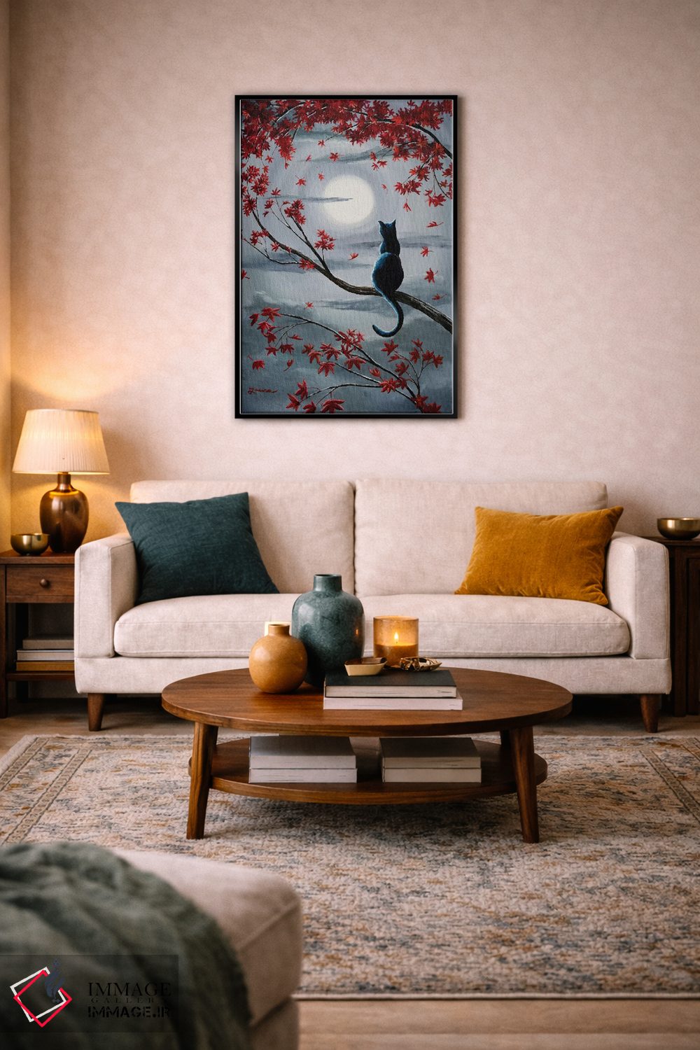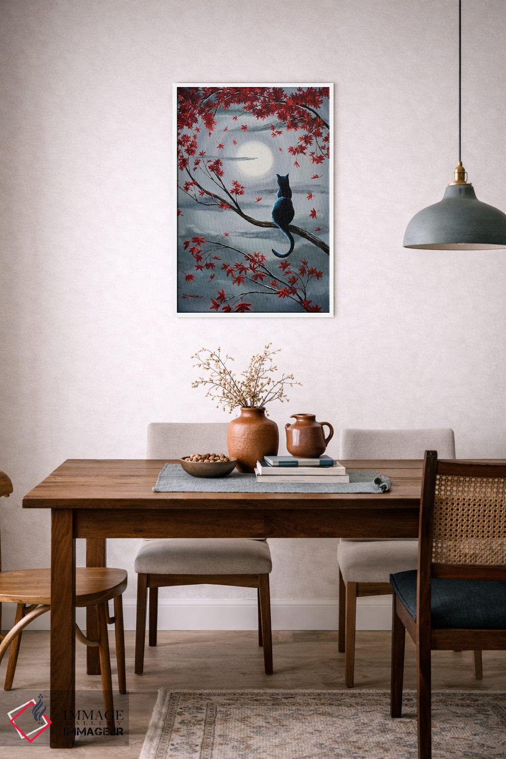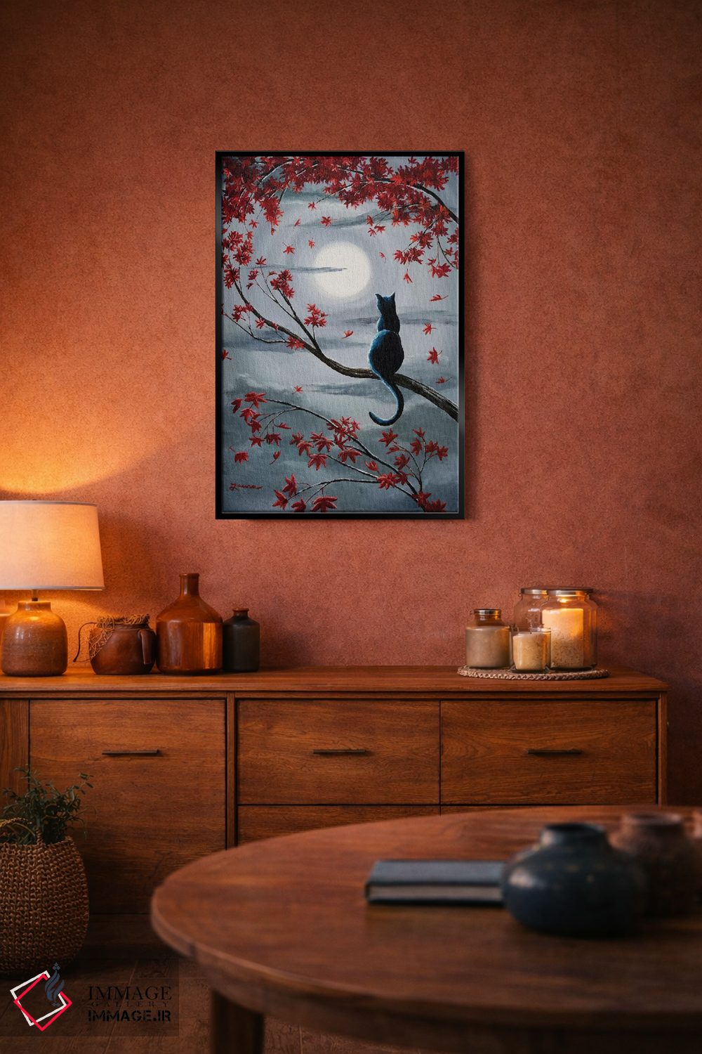 «گربه سیاه در نور ماه نقرهای» اثرِ «لورا ایورسن» میتواند به دیوار، انرژیِ نرم و زنده بدهد؛ برای راهروها و ورودیهای گرم پیشنهاد میشود. هر بار نگاهش میکنید، یک جزئیات تازه به چشم میآید.