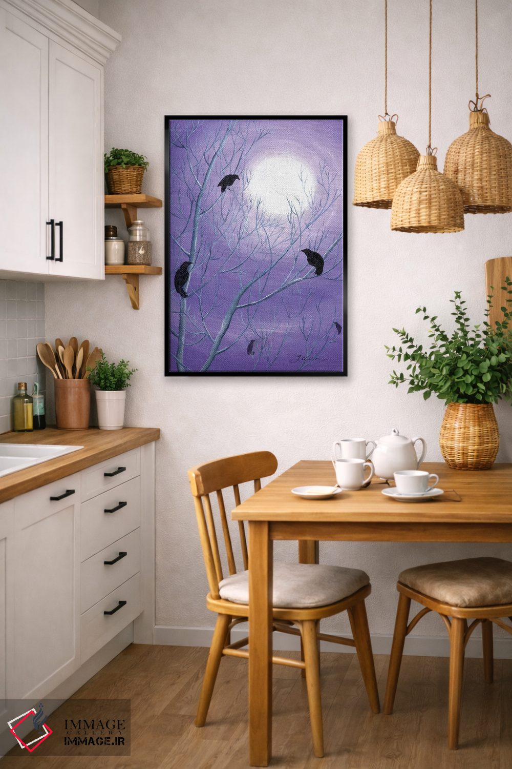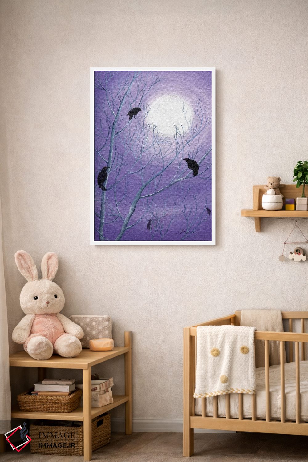 در «کلاغها روی شاخههای خالی» اثرِ «لورا ایورسن»، حضور حیوانات به فضا، گرمیِ ملایم اضافه میکند؛ برای اتاق کودک (بدون لحن کودکانه) انتخابی خوشسلیقه است. برای دیوار گالریوار هم گزینهٔ خوبیست.