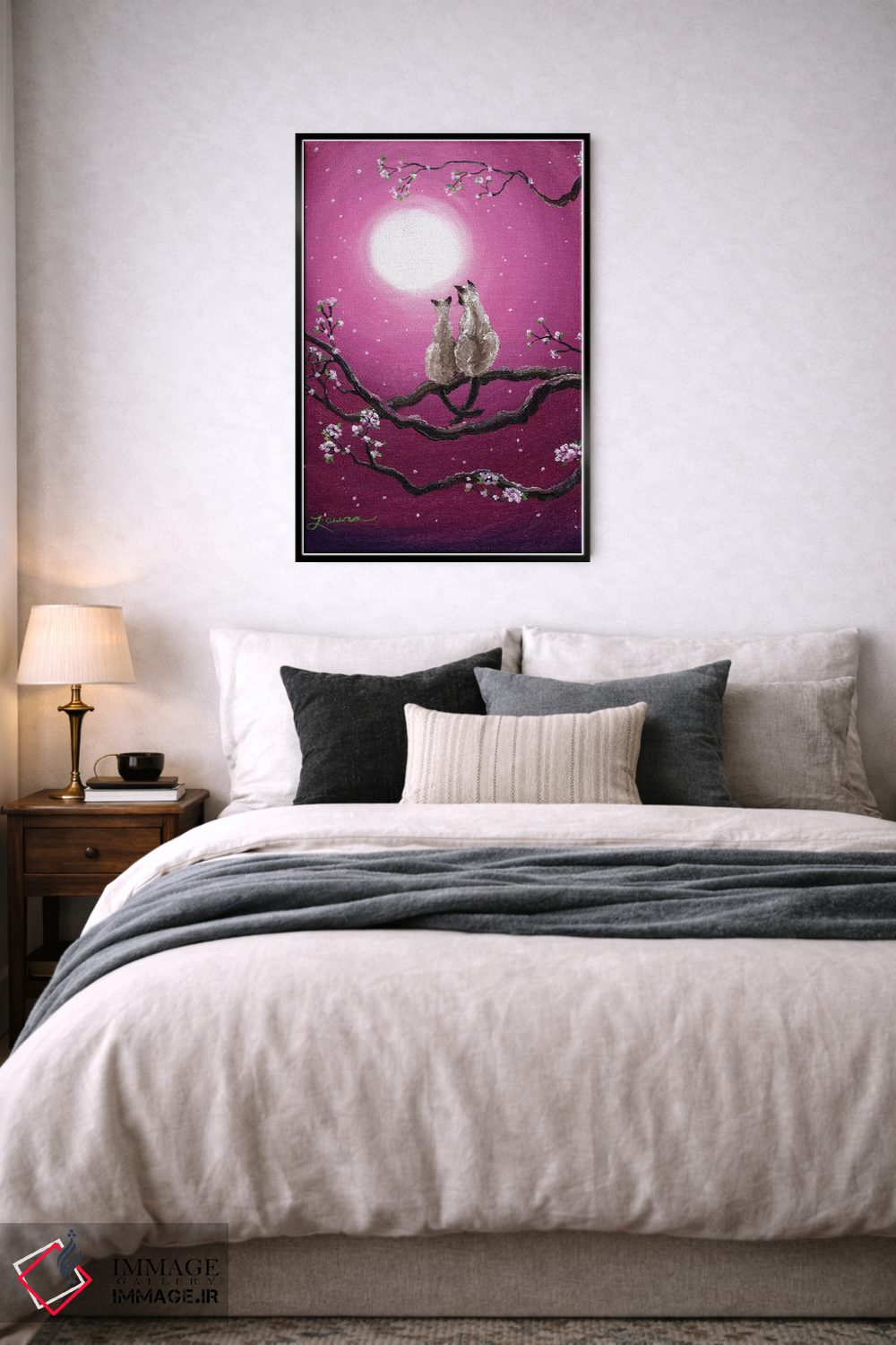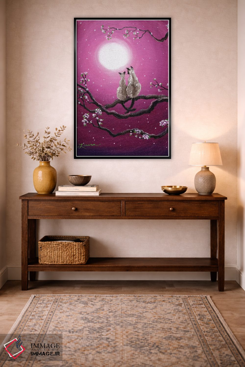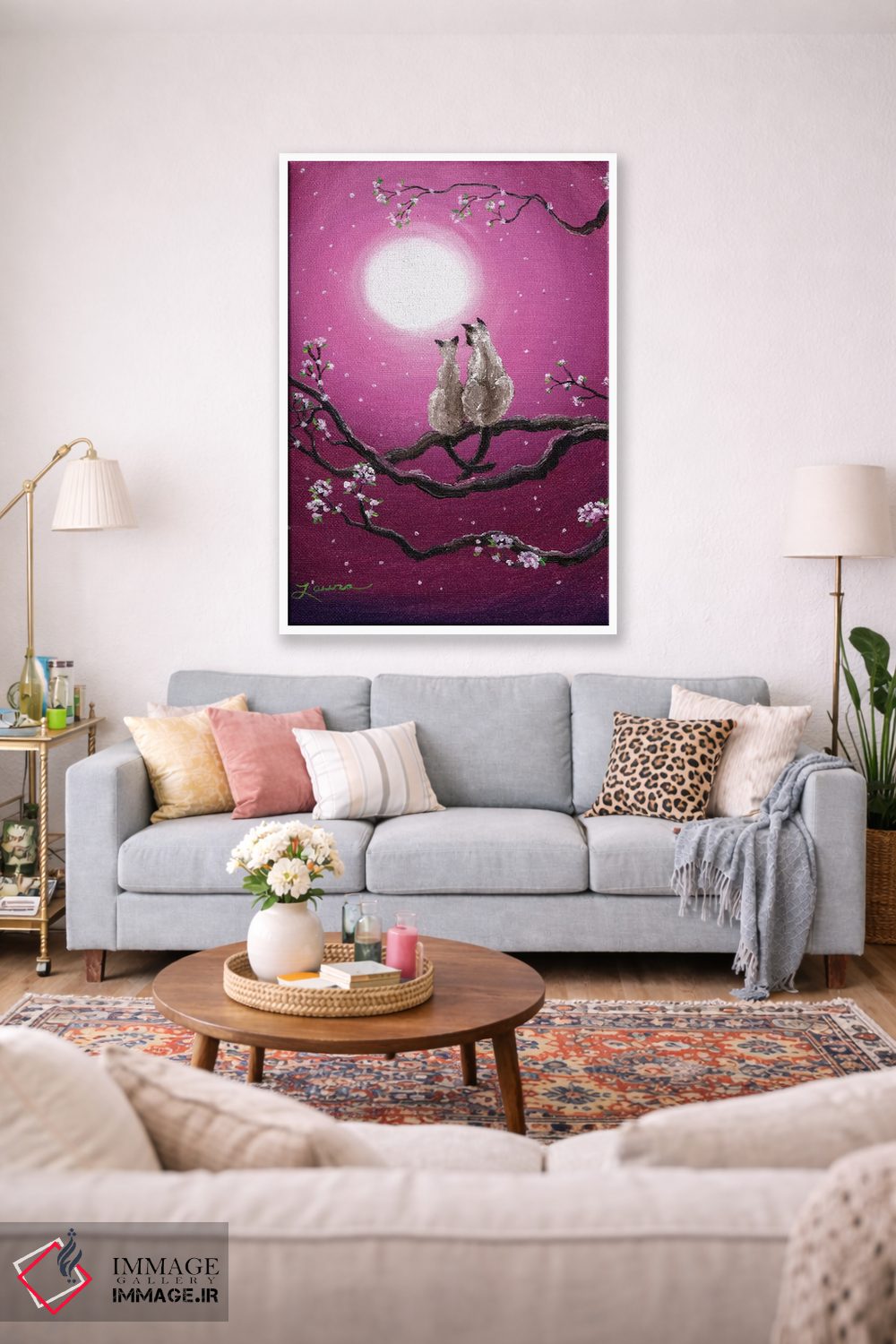 تابلو دکوراتیو گربه های سیامی در شکوفه های بهاری اثر لورا ایورسن