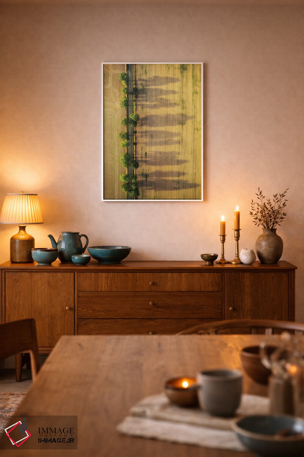 براساس پالت ترکیبی اثر، قاب تیک گرم (چوبی) پیشنهاد اول است و مشکی مات (فریم متوسط) مکمل. برای سفارشهای پروژهای با ابعاد و قابهای اختصاصی با ایماژ در تماس باشید.