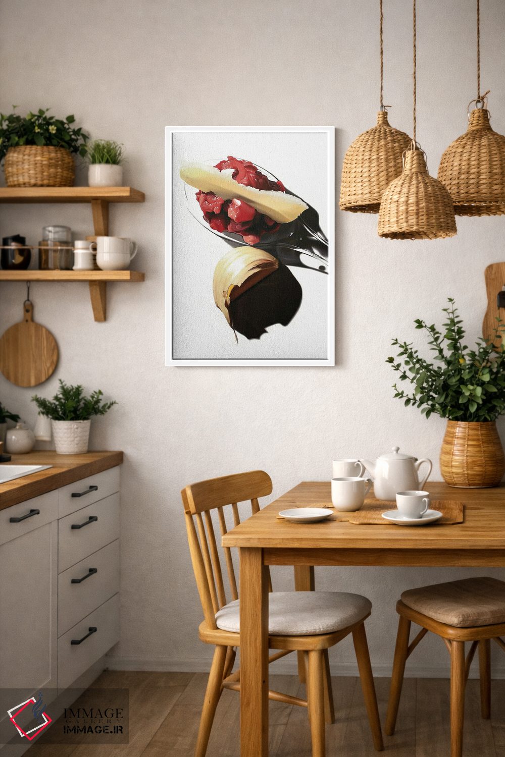 براساس پالت گرم اثر، قاب تیک گرم (چوبی) پیشنهاد اول است و مشکی مات (فریم متوسط) مکمل. برای سفارشهای پروژهای با ابعاد و قابهای اختصاصی با ایماژ در تماس باشید.