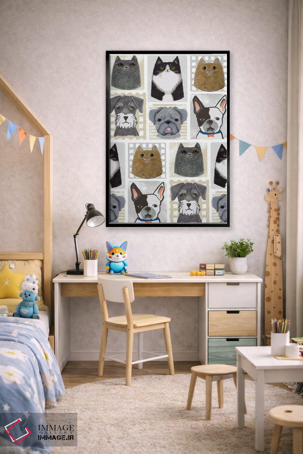 اگر به آثار حیوانات علاقه دارید، «گربهها و سگها» اثرِ «لیندا برتل» در کنار رنگهای خنثی، تضاد دلچسبی میسازد، برای اتاق کودک (بدون لحن کودکانه) گزینهٔ مناسبیست. با قاب چوبی یا مشکی، حس مرتبتری پیدا میکند.