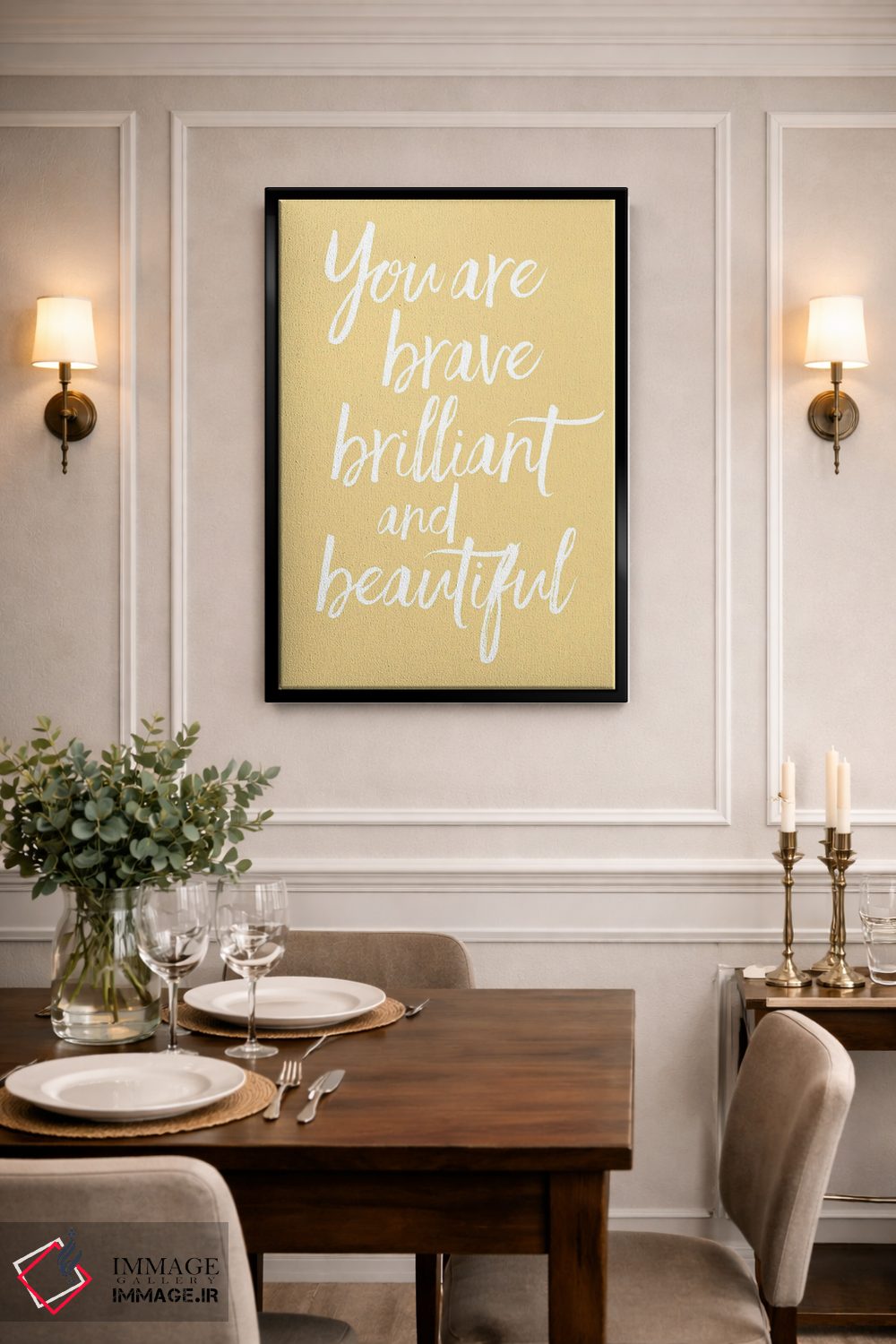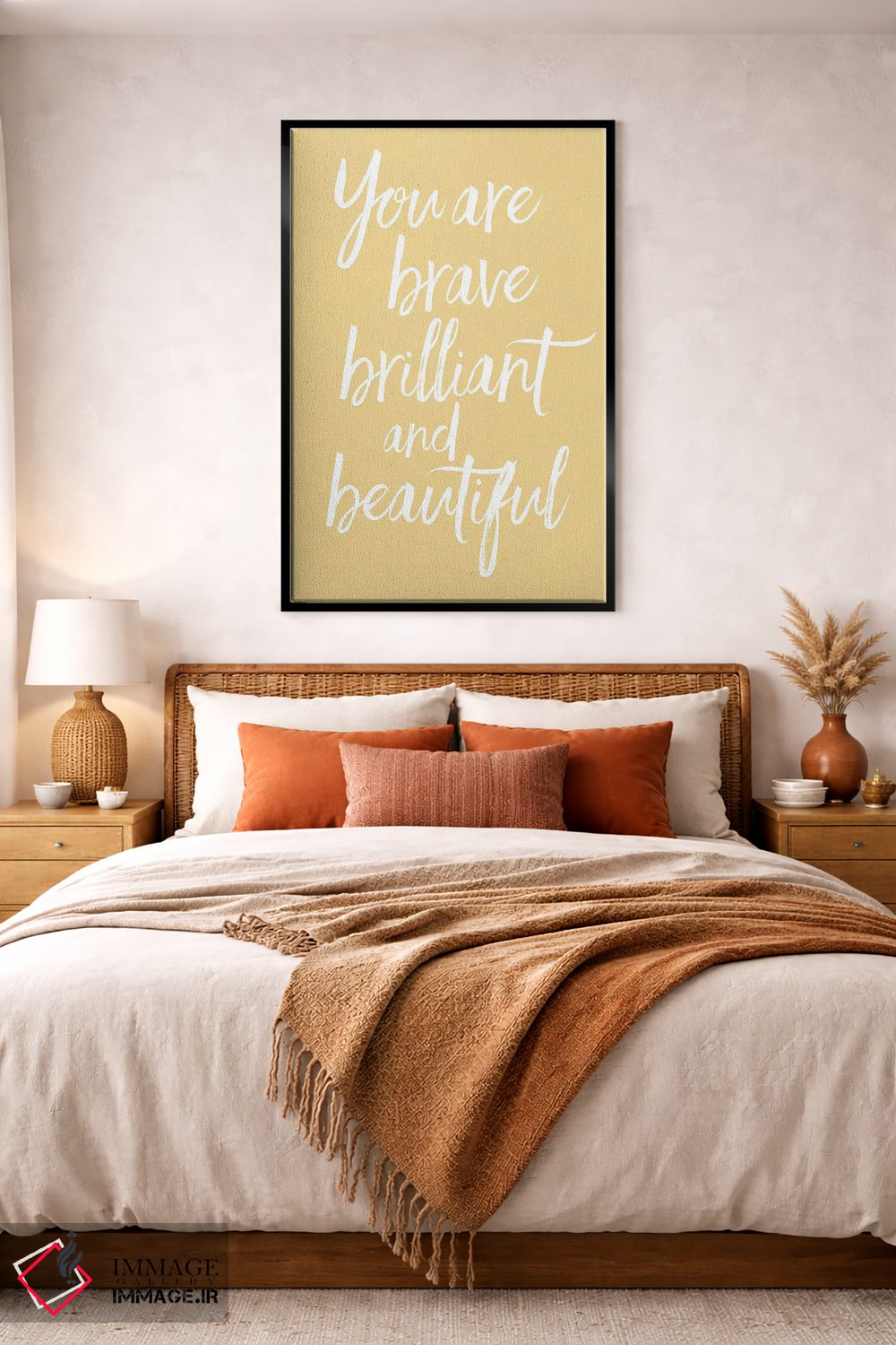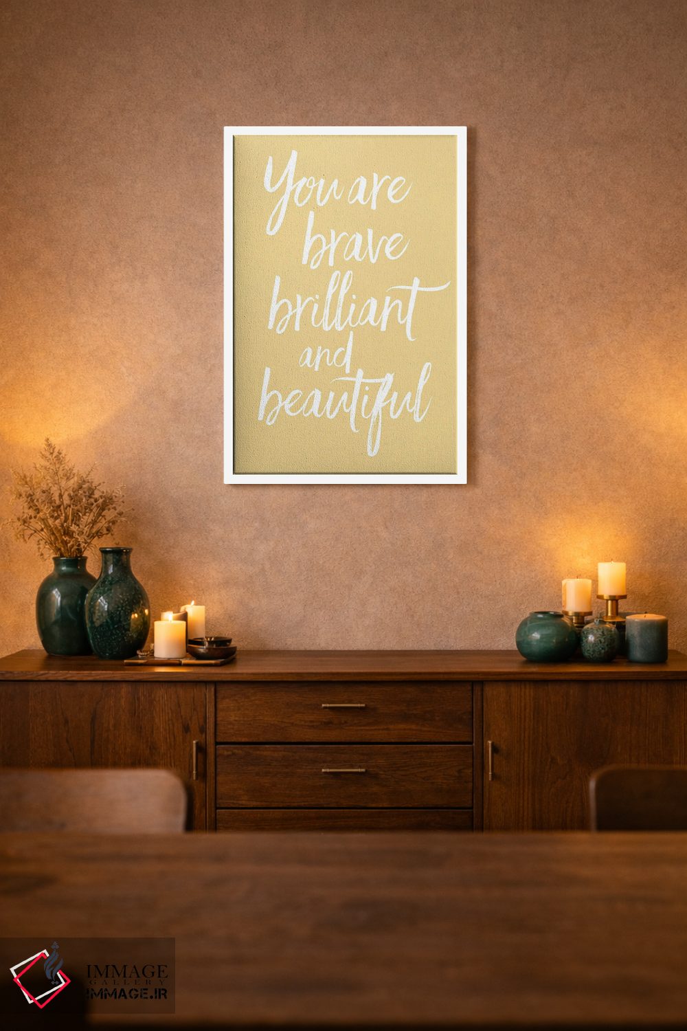 براساس پالت گرم اثر، قاب بلوط روشن (چوبی) پیشنهاد اول است و استخوانی ملایم مکمل. برای سفارشهای پروژهای با ابعاد و قابهای اختصاصی با ایماژ در تماس باشید.