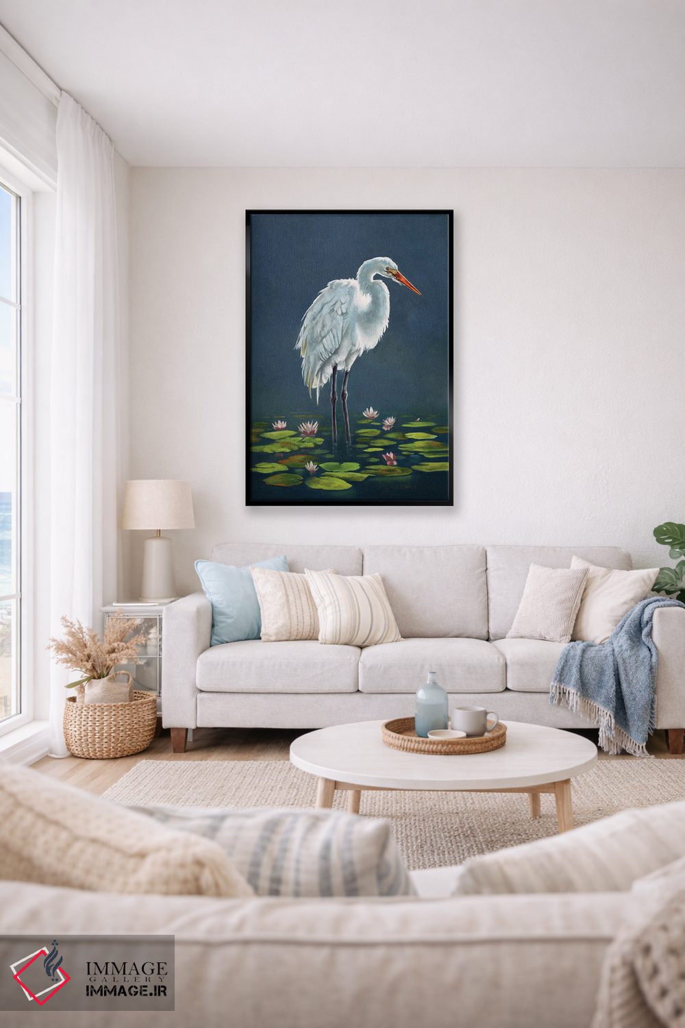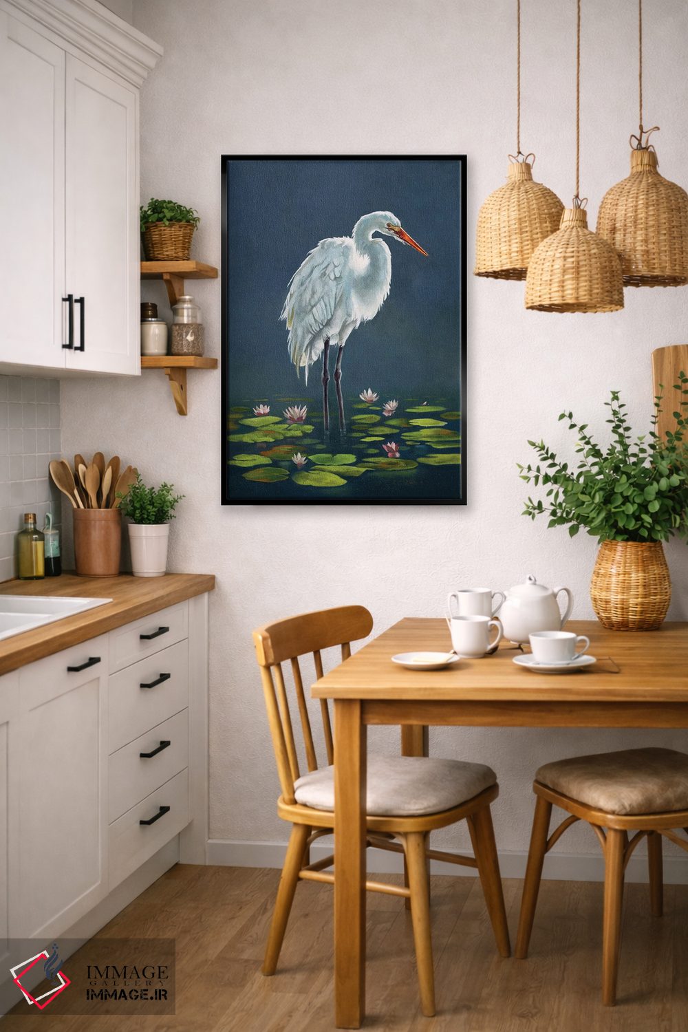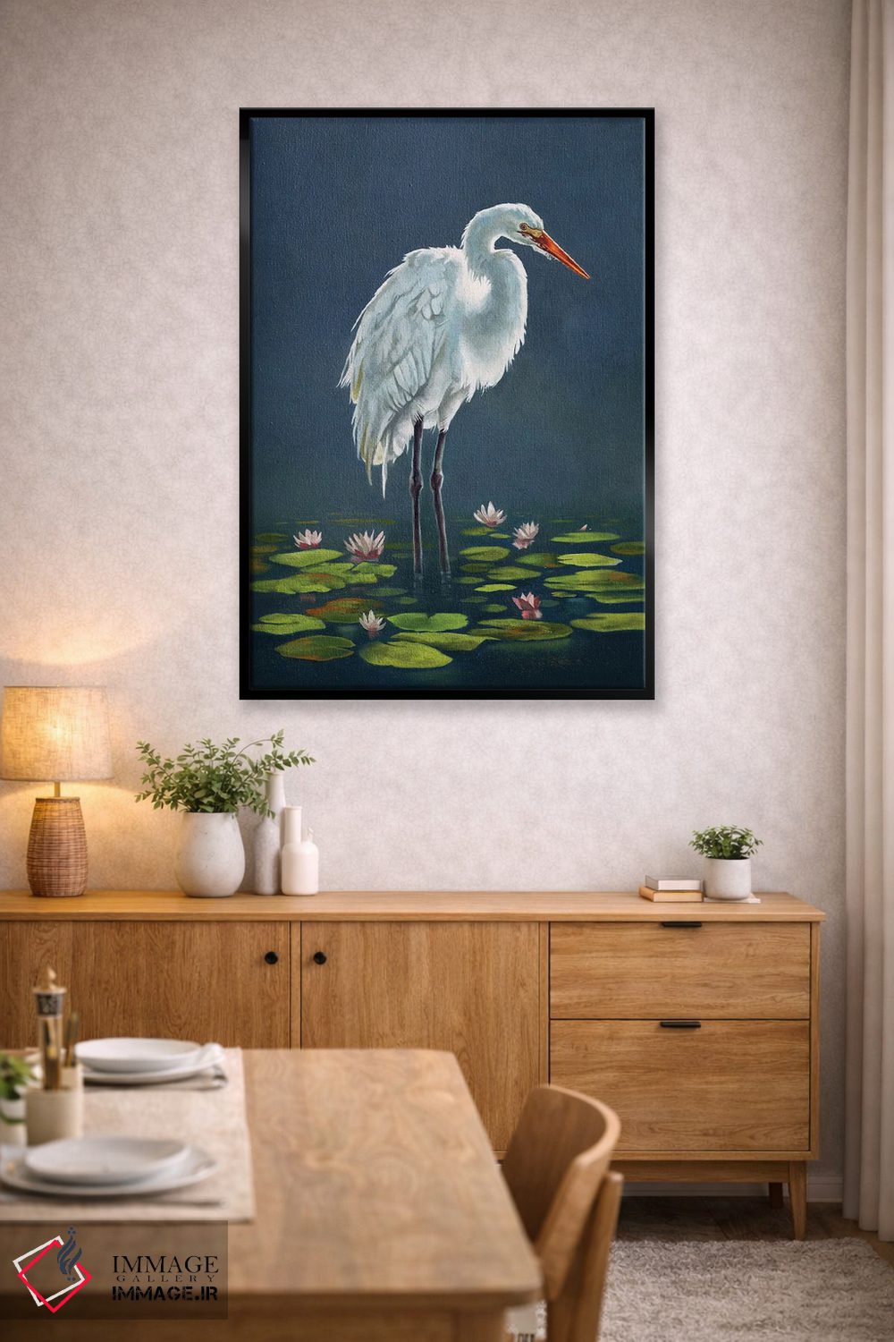 اگر میخواهید دیوار کمی سرزندگیِ محترمانه داشته باشد، «حواصیل میان برگهای نیلوفر آبی» اثرِ «لوکا شپرد» فضا را صمیمیتر و دعوتکنندهتر نشان میدهد، برای اتاق کودک (بدون لحن کودکانه) گزینهٔ مناسبیست. در کنار گیاهان و نور طبیعی، جذابتر هم میشود.