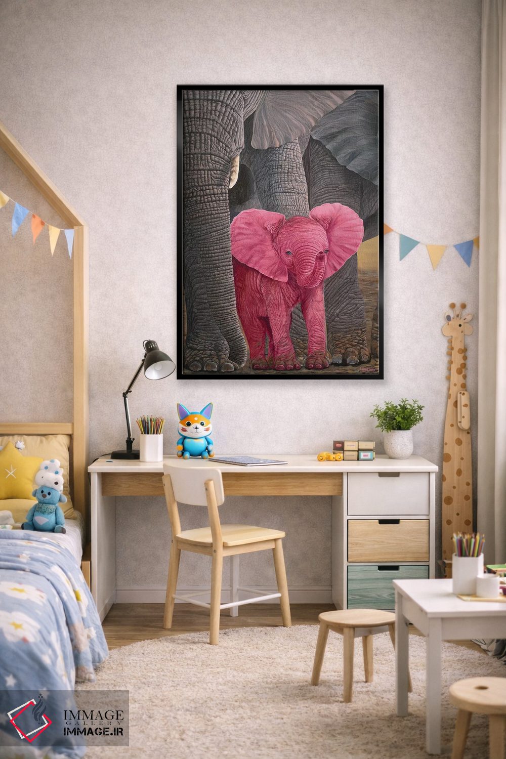 اگر دوست دارید هماهنگی کاملتر شود، رنگِ صورتی را در صندلی تک یا کوسن تک جا بدهید تا نگاه به سمت اثر هدایت شود.