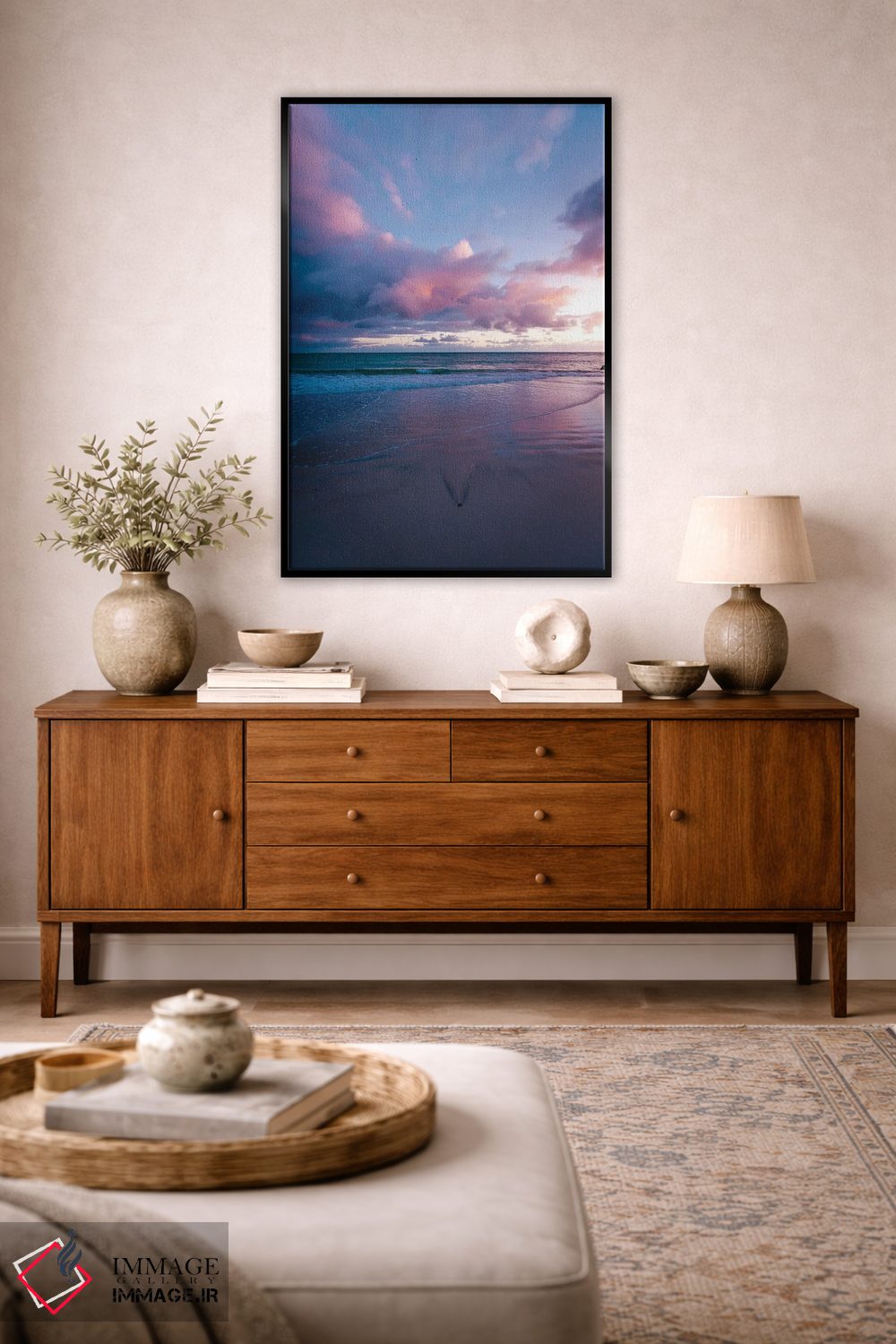 بوم گالری ایماژ نسخهی دکوراتیوِ سطحبالا از یک اثر هنری است؛ روی کنواس سفیدِ یکدست و بدون اسید با چاپ هنریِ دقیق (Giclée) برای گذارهای نرمتر و وضوح بالاتر با جوهرهای آرشیویِ حرفهای برای لایههای رنگی خواناتر؛ روی دیوار، کار یکدستتر و خوشکیفیتتر دیده میشود. کلافکشی مرتب و یراق نصب استاندارد، تجربهی نصب را ساده میکند.