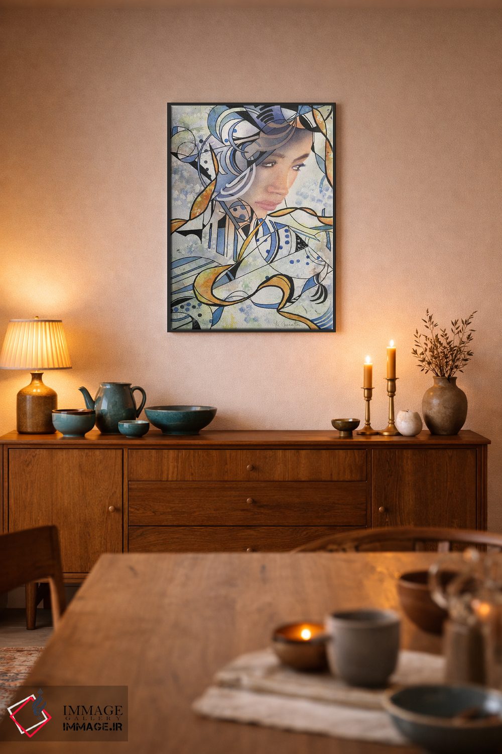 براساس پالت ترکیبی اثر، قاب بلوط روشن (چوبی) پیشنهاد اول است و استخوانی ملایم مکمل. برای سفارشهای پروژهای با ابعاد و قابهای اختصاصی با ایماژ در تماس باشید.