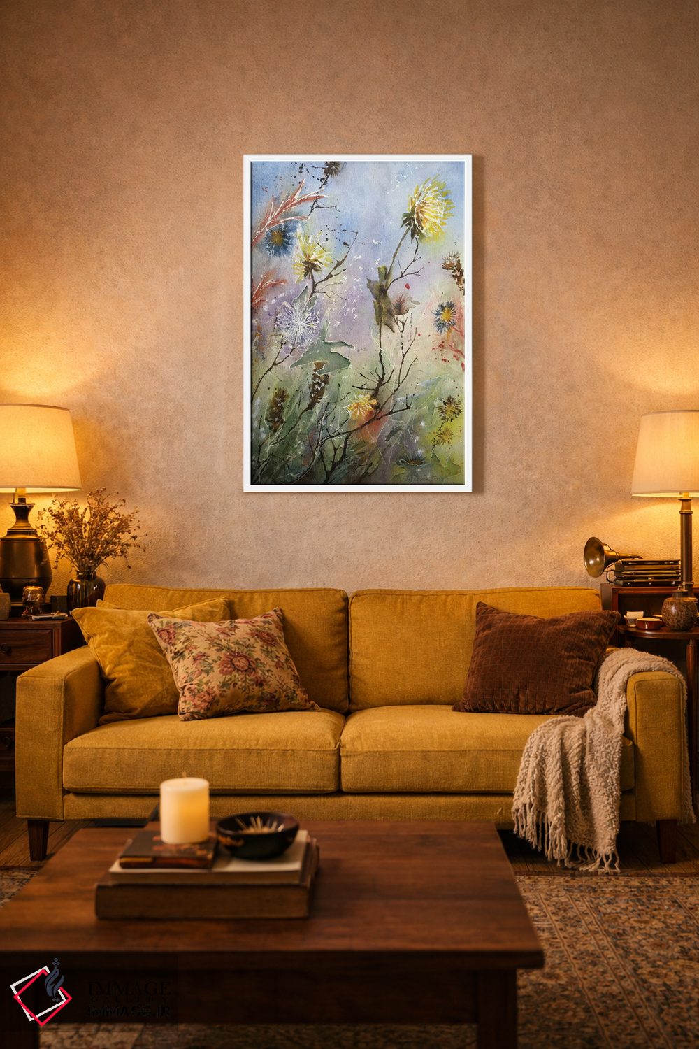 برای دیواری که میخواهید نرمتر دیده شود، «قاصدکها و خارها (همچنین)» اثرِ «لیز کاوینگتون» به دیوار، روشناییِ ملایم و دلنشین میدهد؛ برای اتاق خواب انتخابی خوشسلیقه است. با قاب روشن یا چوبی، حس طبیعیتری پیدا میکند.