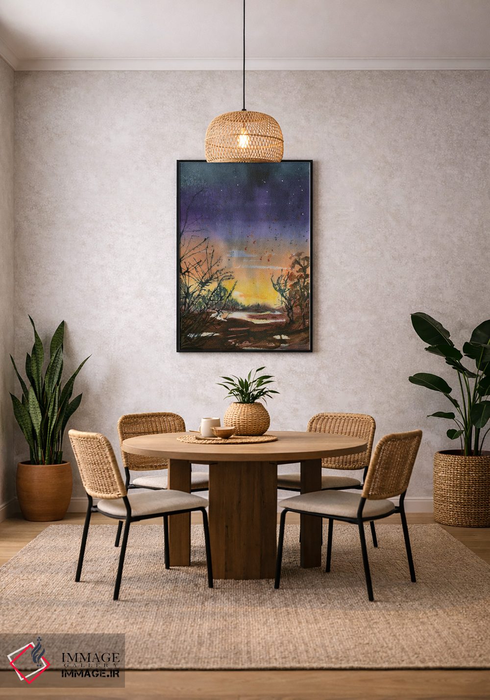 براساس پالت ترکیبی اثر، قاب تیک گرم (چوبی) پیشنهاد اول است و مشکی مات (فریم متوسط) مکمل. برای سفارشهای پروژهای با ابعاد و قابهای اختصاصی با ایماژ در تماس باشید.