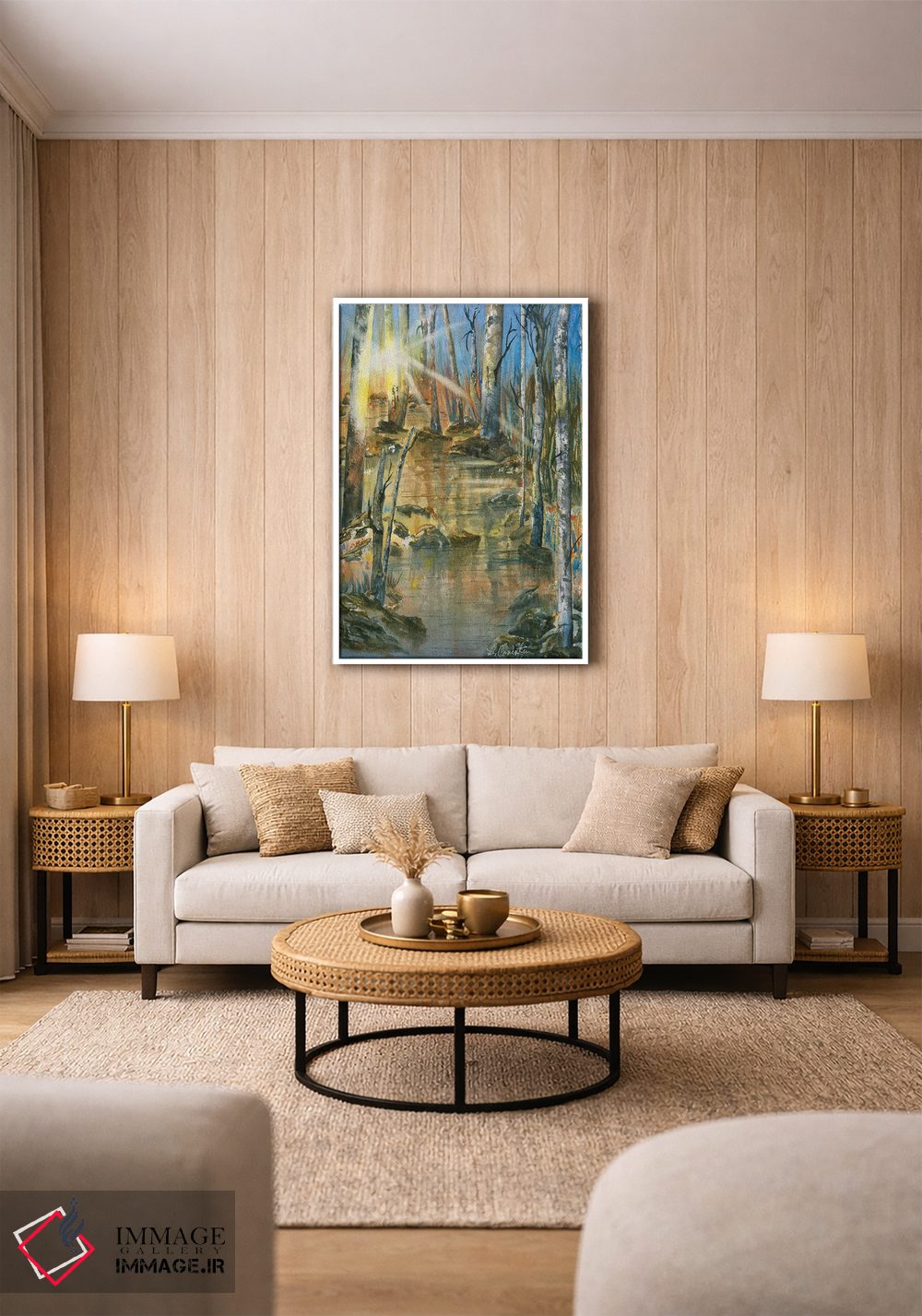 براساس پالت ترکیبی اثر، قاب بلوط روشن (چوبی) پیشنهاد اول است و استخوانی ملایم مکمل. برای سفارشهای پروژهای با ابعاد و قابهای اختصاصی با ایماژ در تماس باشید.