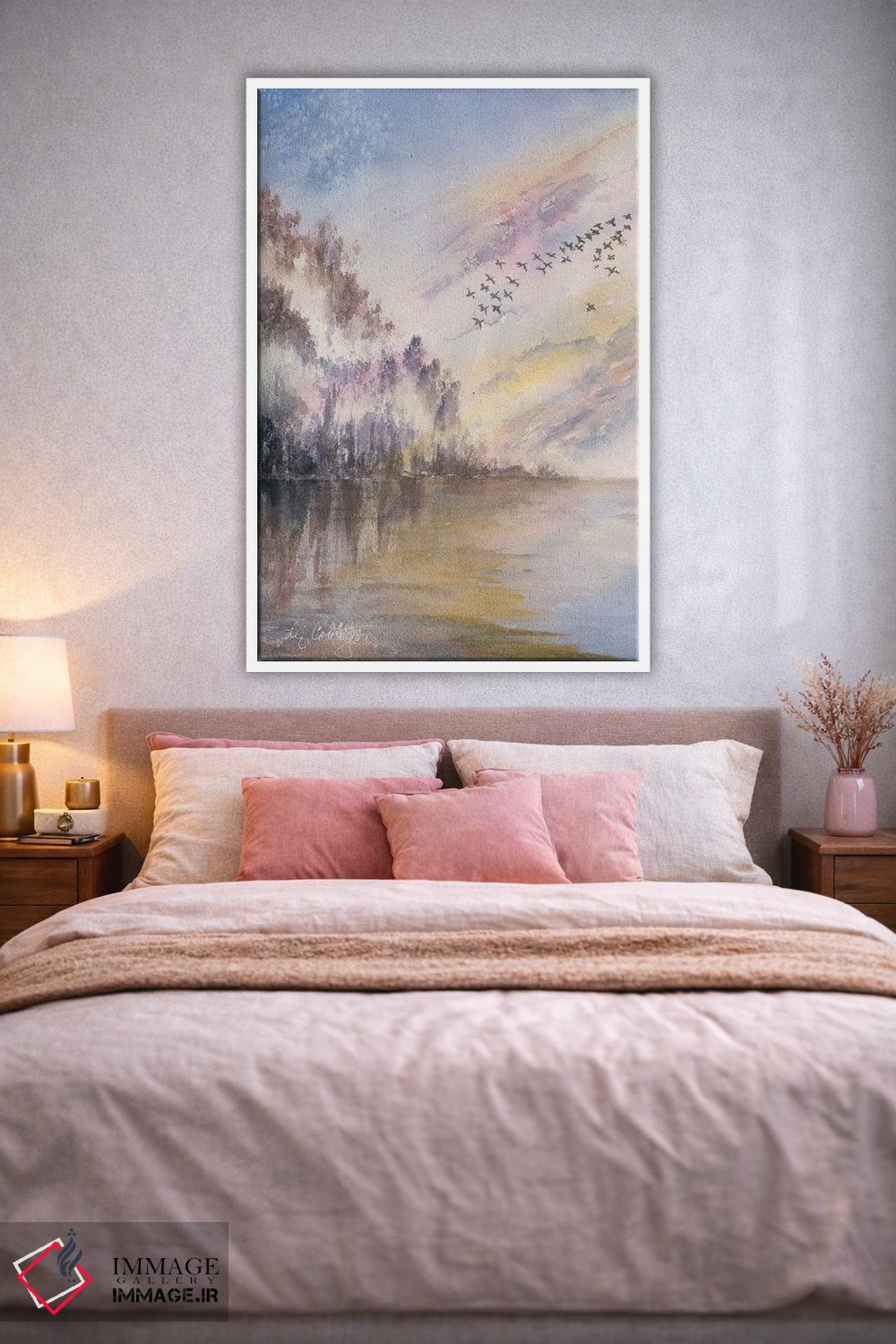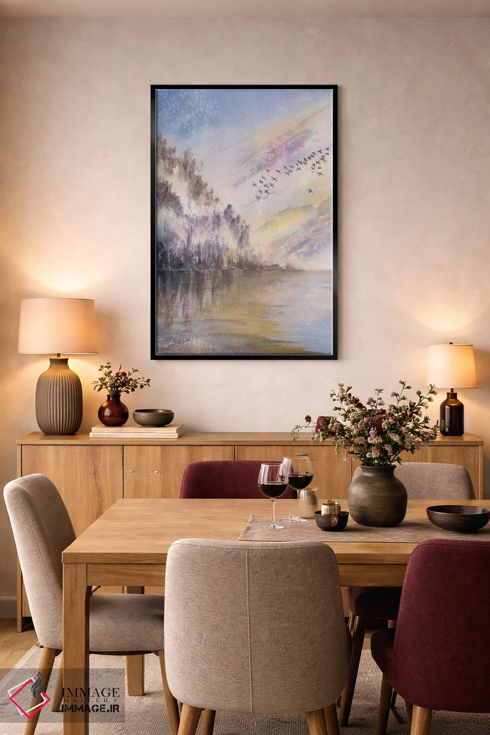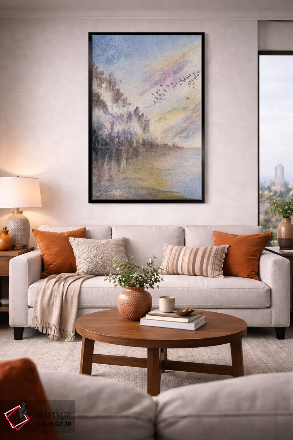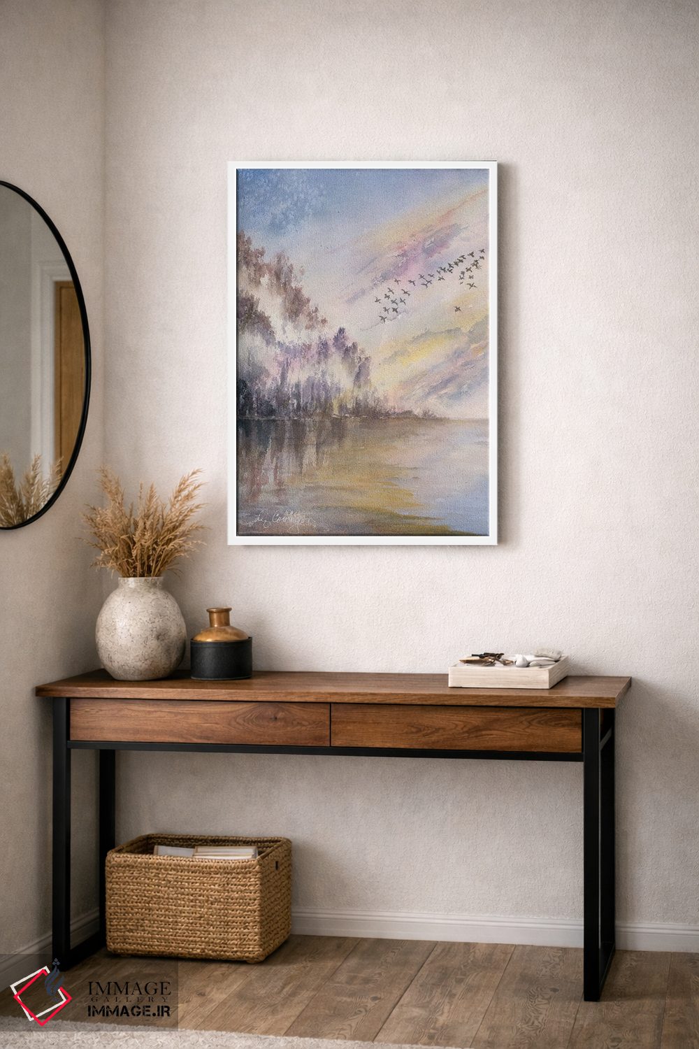 براساس پالت گرم اثر، قاب بلوط روشن (چوبی) پیشنهاد اول است و استخوانی ملایم مکمل. برای سفارشهای پروژهای با ابعاد و قابهای اختصاصی با ایماژ در تماس باشید.