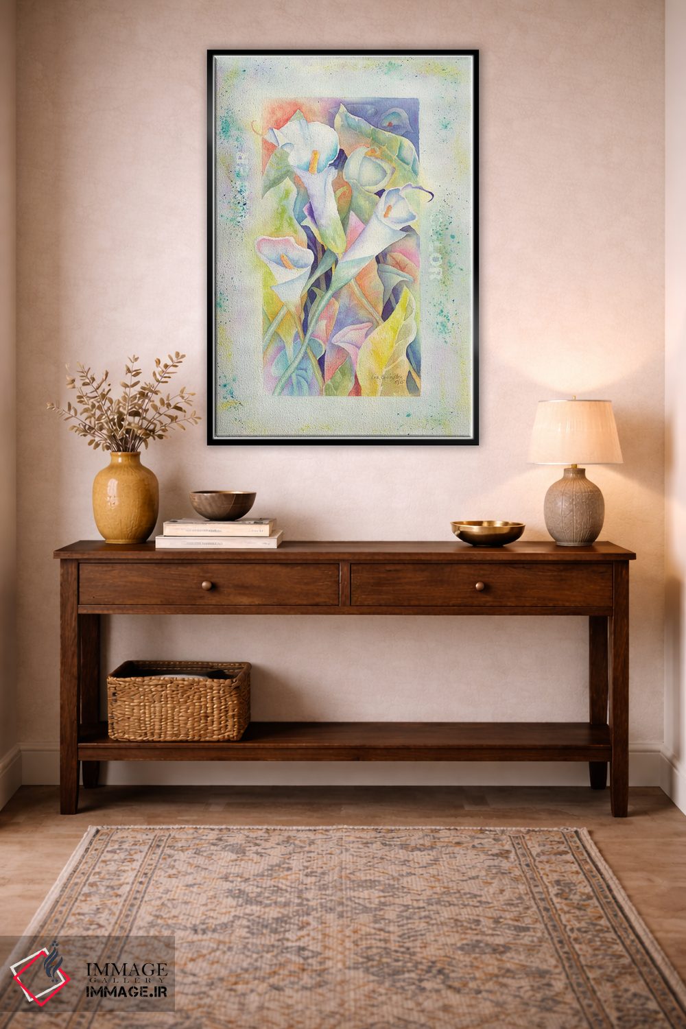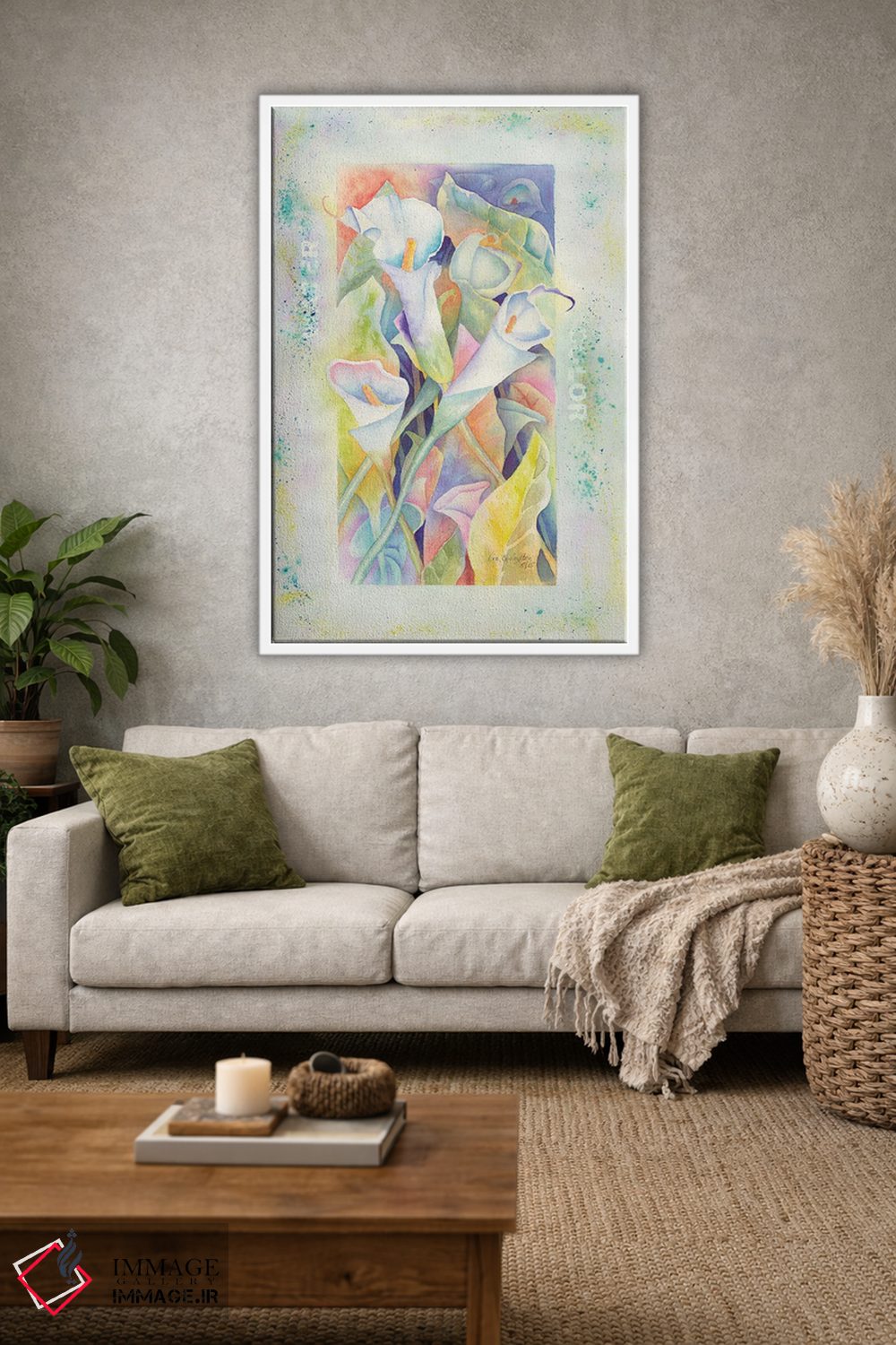 اگر دوست دارید دیوار روشنتر و آرامتر دیده شود، «کالاها با آبرنگ (نوعی گل)» اثرِ «لیز کاوینگتون» به دیوار، روشناییِ ملایم و دلنشین میدهد، برای فضاهای بوهمی گزینهٔ مناسبیست. جزئیاتش از نزدیک هم ارزش تماشا دارد.