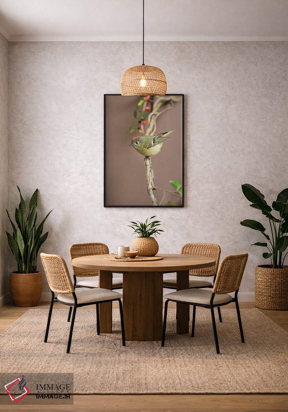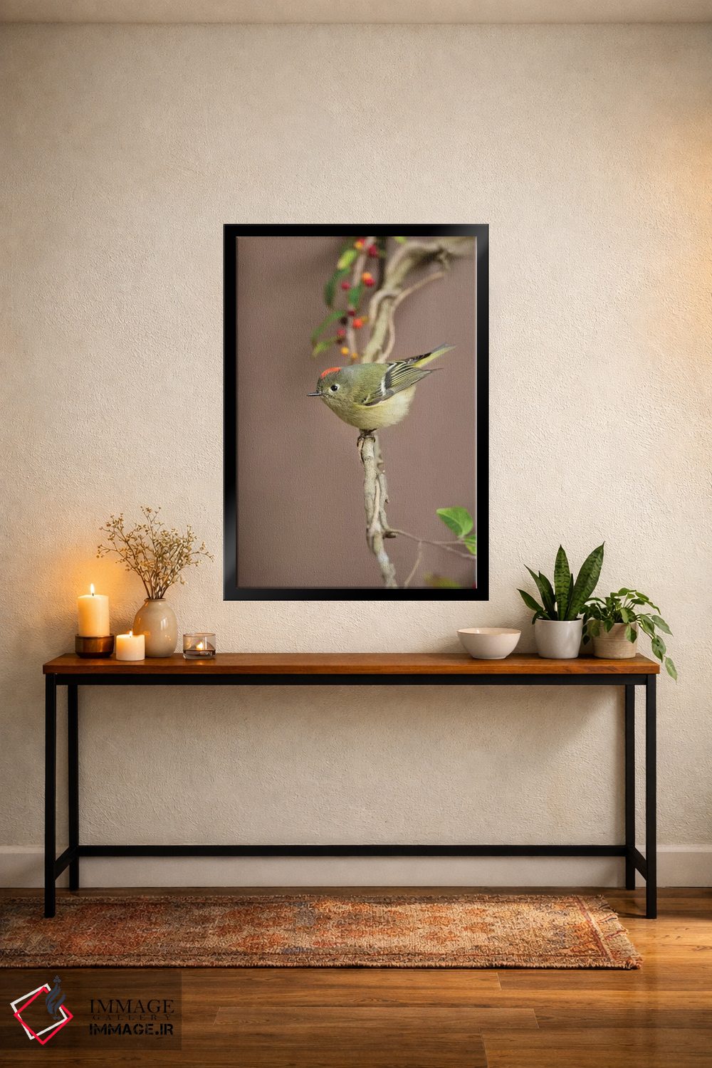 «کینگلت تاجسرخ (Regulus calendula) نشسته» اثرِ «لری دیتو» میتواند در کنار رنگهای خنثی، تضاد دلچسبی بسازد؛ برای دیوار کنار میز کار پیشنهاد میشود. در کنار گیاهان و نور طبیعی، جذابتر هم میشود.