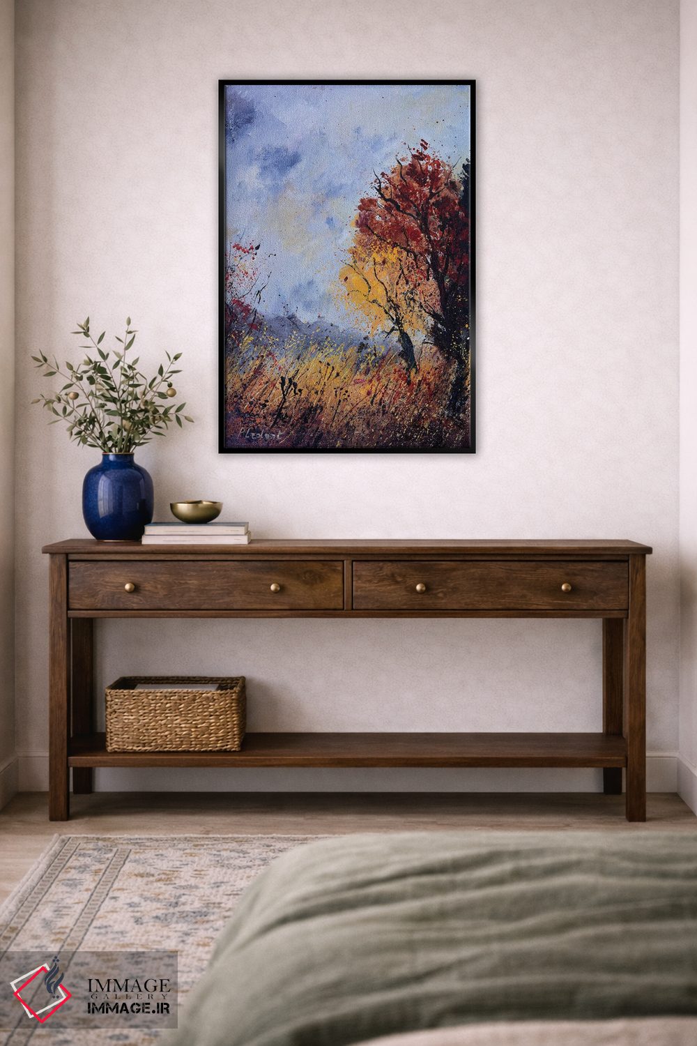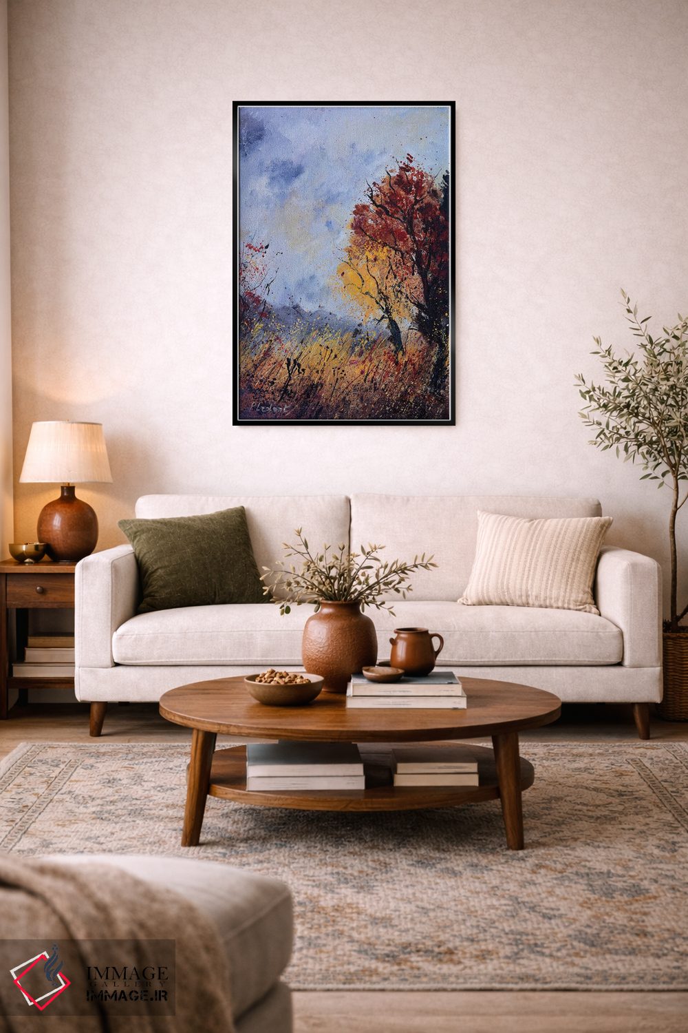 براساس پالت ترکیبی اثر، قاب تیک گرم (چوبی) پیشنهاد اول است و مشکی مات (فریم متوسط) مکمل. برای سفارشهای پروژهای با ابعاد و قابهای اختصاصی با ایماژ در تماس باشید.