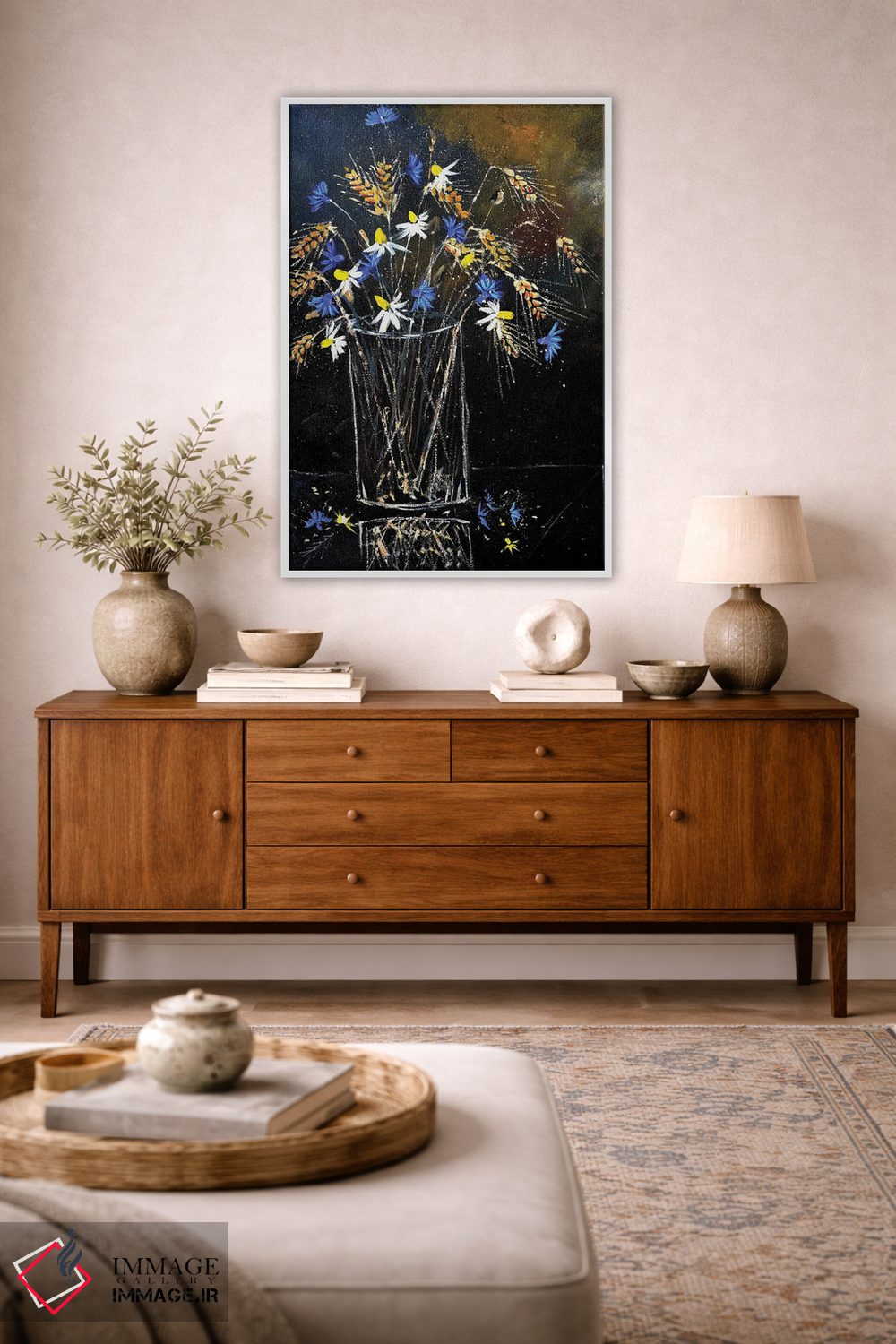براساس پالت ترکیبی اثر، قاب تیک گرم (چوبی) پیشنهاد اول است و مشکی مات (فریم متوسط) مکمل. برای سفارشهای پروژهای با ابعاد و قابهای اختصاصی با ایماژ در تماس باشید.