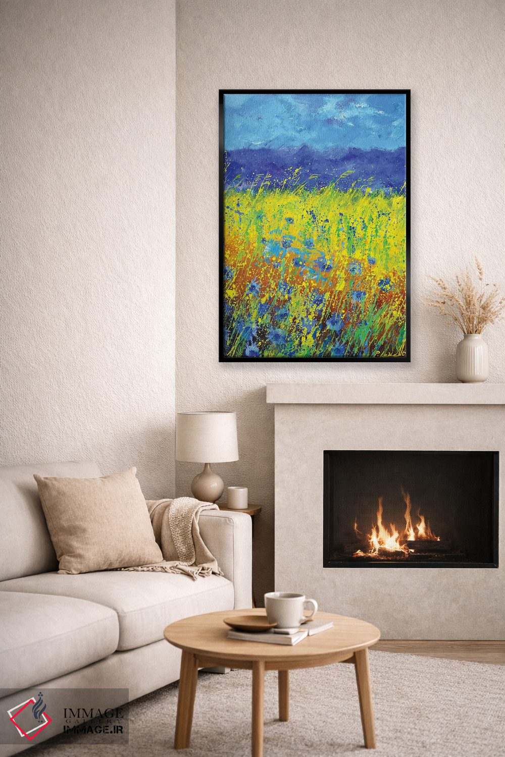 برای یک نقطهٔ کانونی قوی، «گلهای گندمنمای آبی» اثرِ «پل لدنت» در سبک هنری گزینهی درخشانی است—بهخصوص با موضوعِ این اثر.