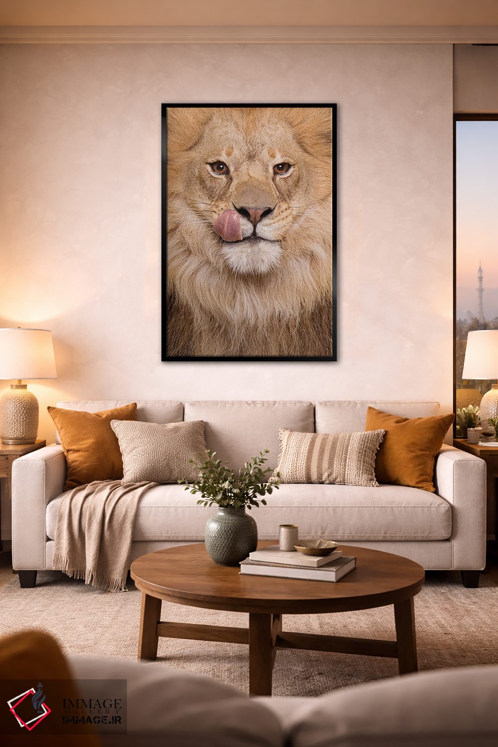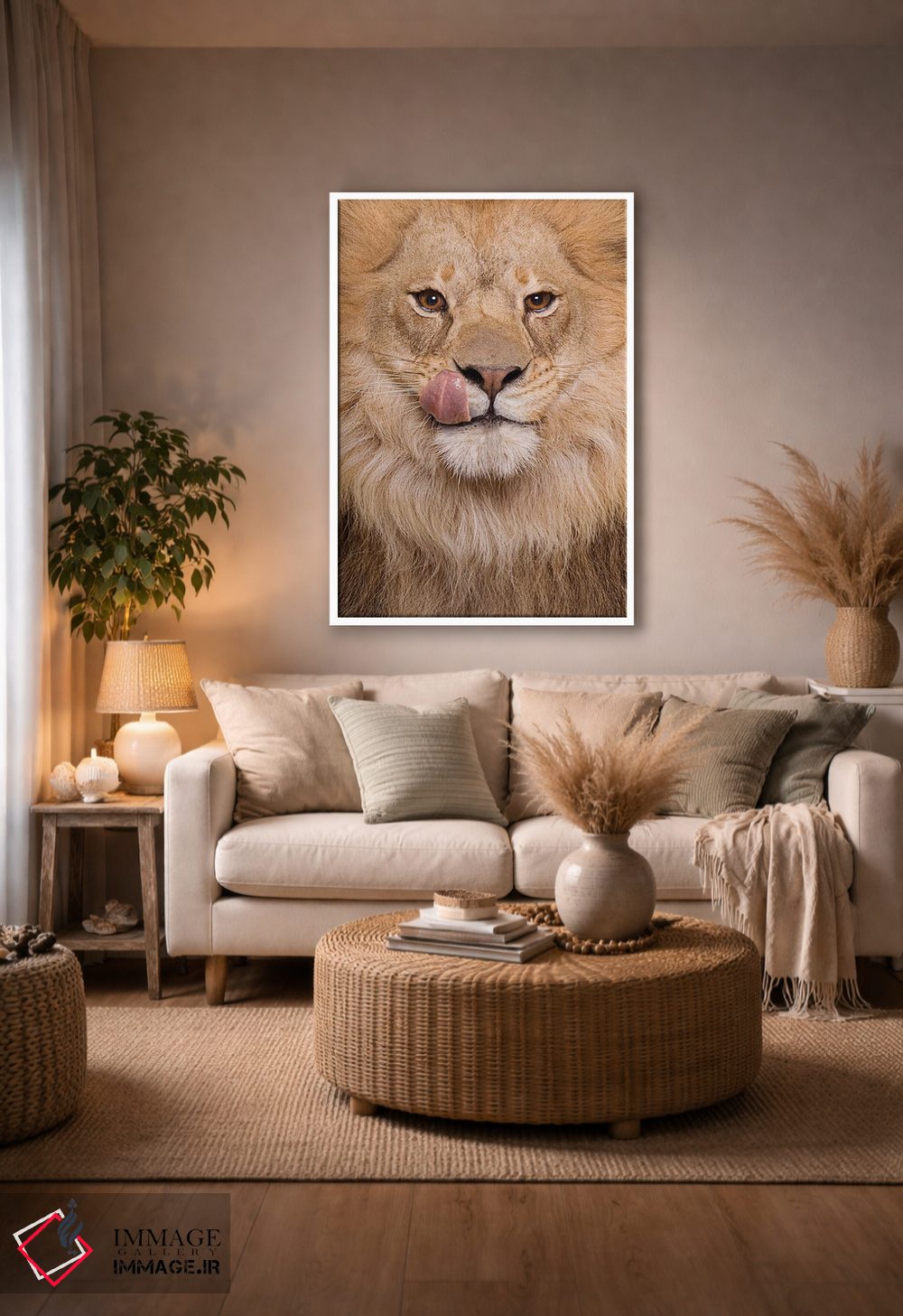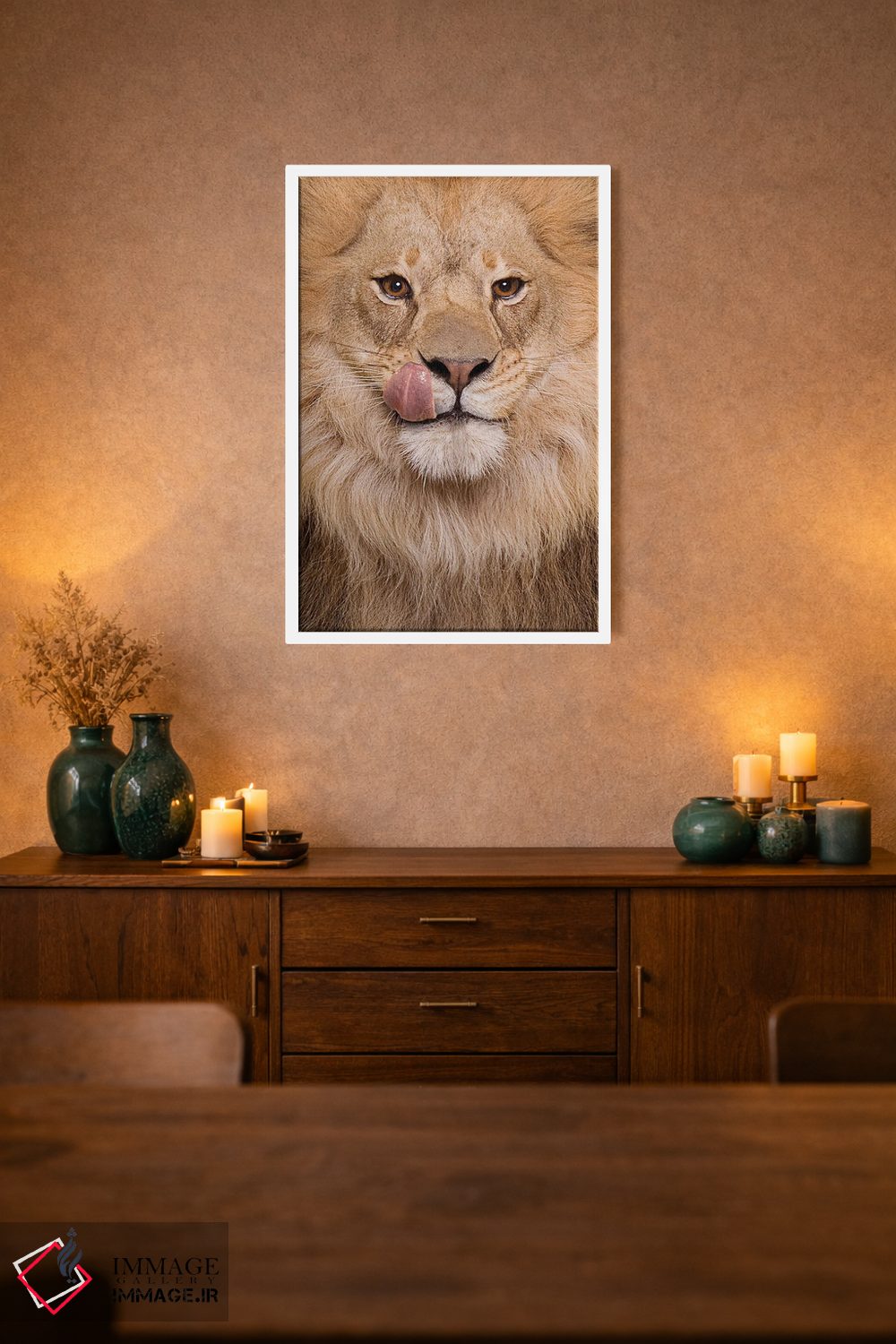 برای دیوارهای ساده، «شیر گرسنه» اثرِ «لوند روزر» به فضا، گرمیِ ملایم اضافه میکند؛ برای خانههایی با چوب و پارچههای گرم انتخابی خوشسلیقه است. با قاب چوبی یا مشکی، حس مرتبتری پیدا میکند.