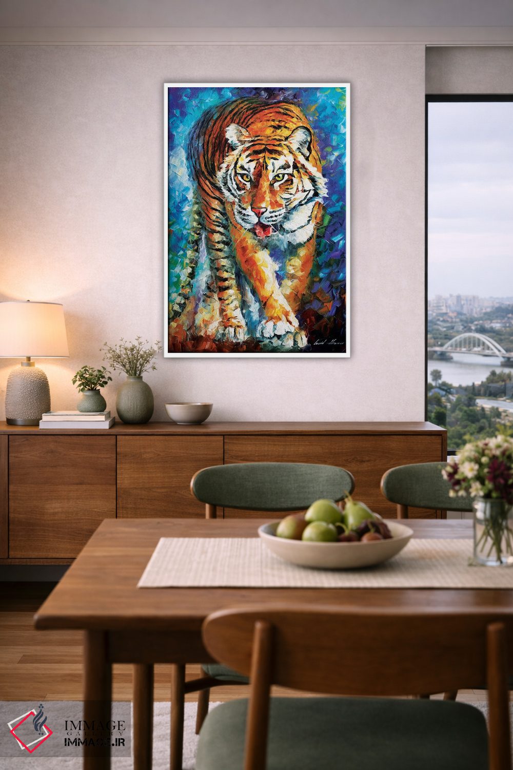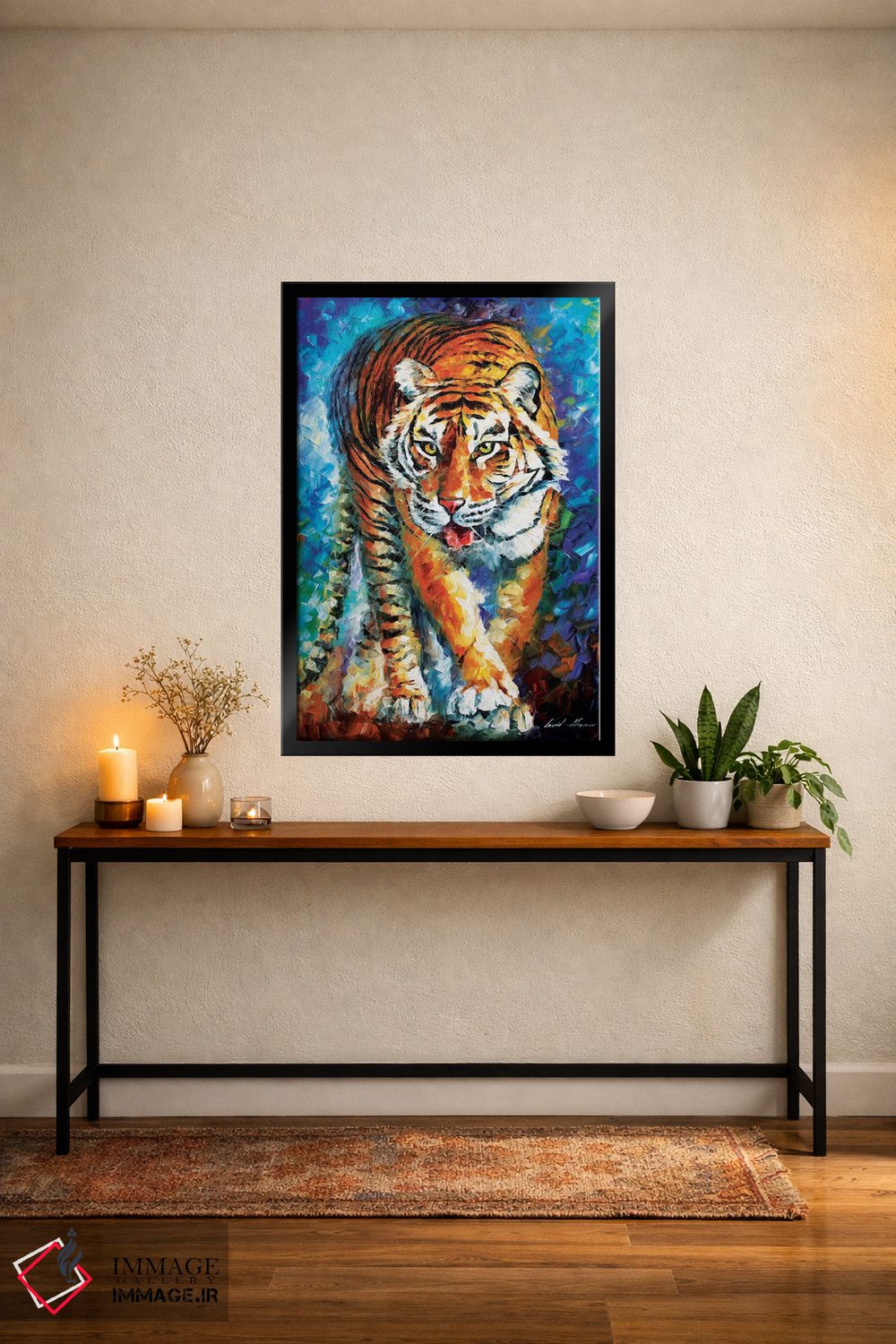 براساس پالت ترکیبی اثر، قاب تیک گرم (چوبی) پیشنهاد اول است و مشکی مات (فریم متوسط) مکمل. برای سفارشهای پروژهای با ابعاد و قابهای اختصاصی با ایماژ در تماس باشید.