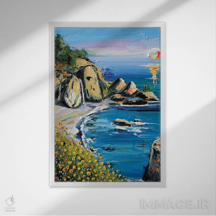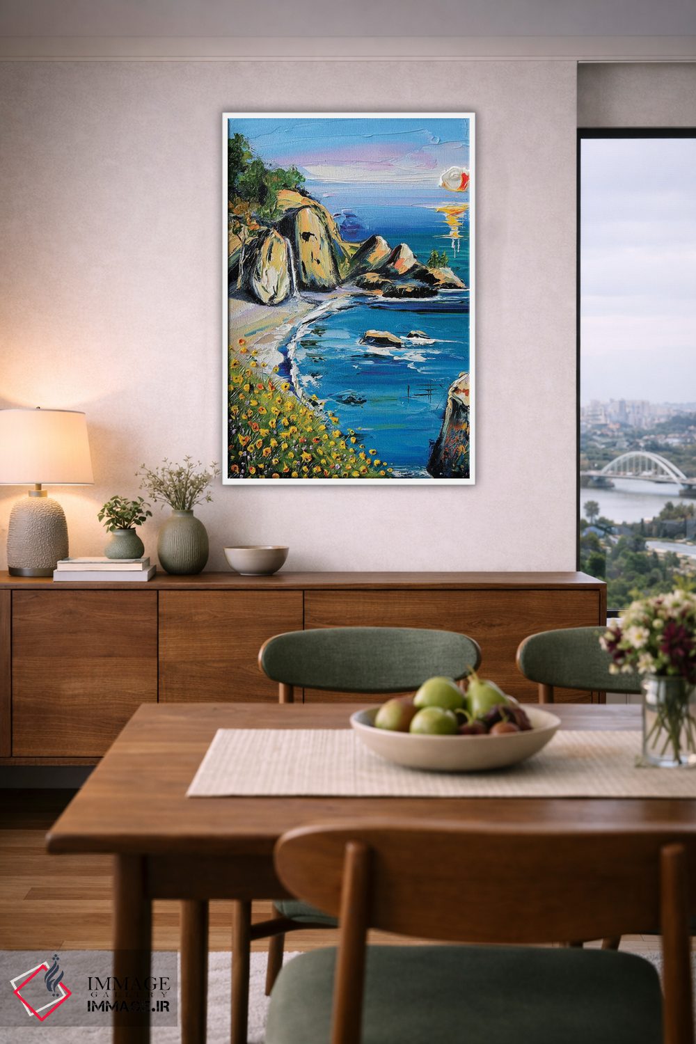 براساس پالت ترکیبی اثر، قاب تیک گرم (چوبی) پیشنهاد اول است و مشکی مات (فریم متوسط) مکمل. برای سفارشهای پروژهای با ابعاد و قابهای اختصاصی با ایماژ در تماس باشید.
