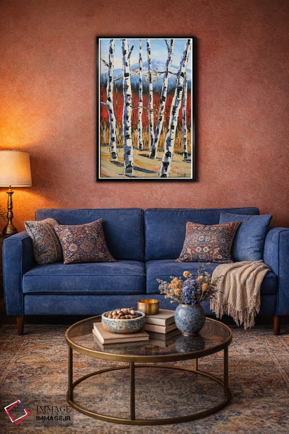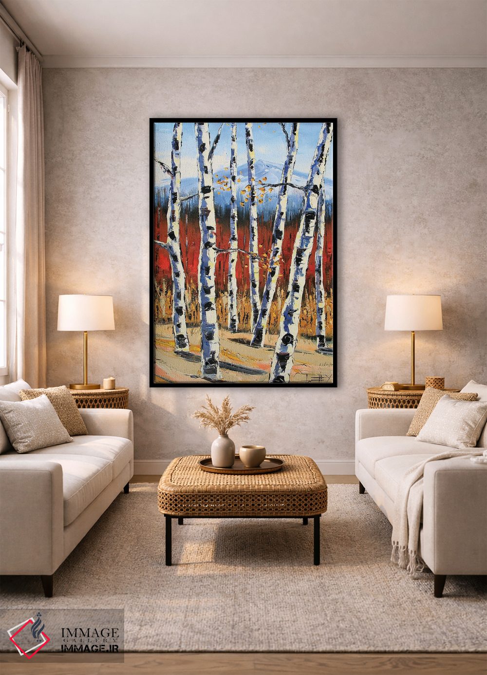 براساس پالت ترکیبی اثر، قاب تیک گرم (چوبی) پیشنهاد اول است و مشکی مات (فریم متوسط) مکمل. برای سفارشهای پروژهای با ابعاد و قابهای اختصاصی با ایماژ در تماس باشید.