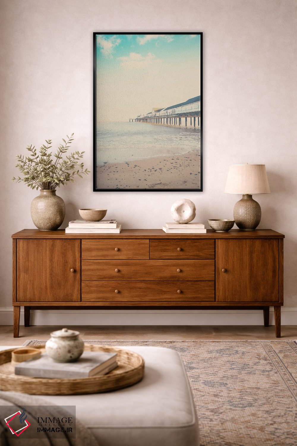 براساس پالت سرد اثر، قاب بلوط روشن (چوبی) پیشنهاد اول است و استخوانی ملایم مکمل. برای سفارشهای پروژهای با ابعاد و قابهای اختصاصی با ایماژ در تماس باشید.