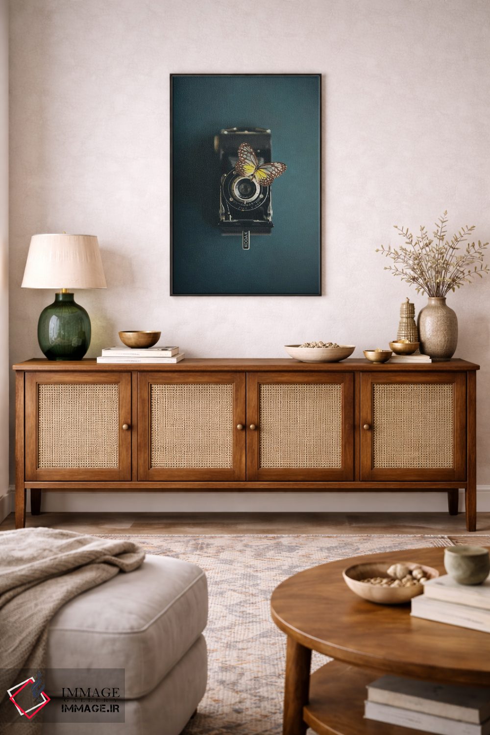 «یک دوربین قدیمی و یک پروانه» اثرِ «لورا ایوانز» با حالوهوای دکوراسیون جایگزین و موضوعِ این اثر، برای فضاهای خلاقانه و متفاوت انتخابی جسورانه اما مرتب است.