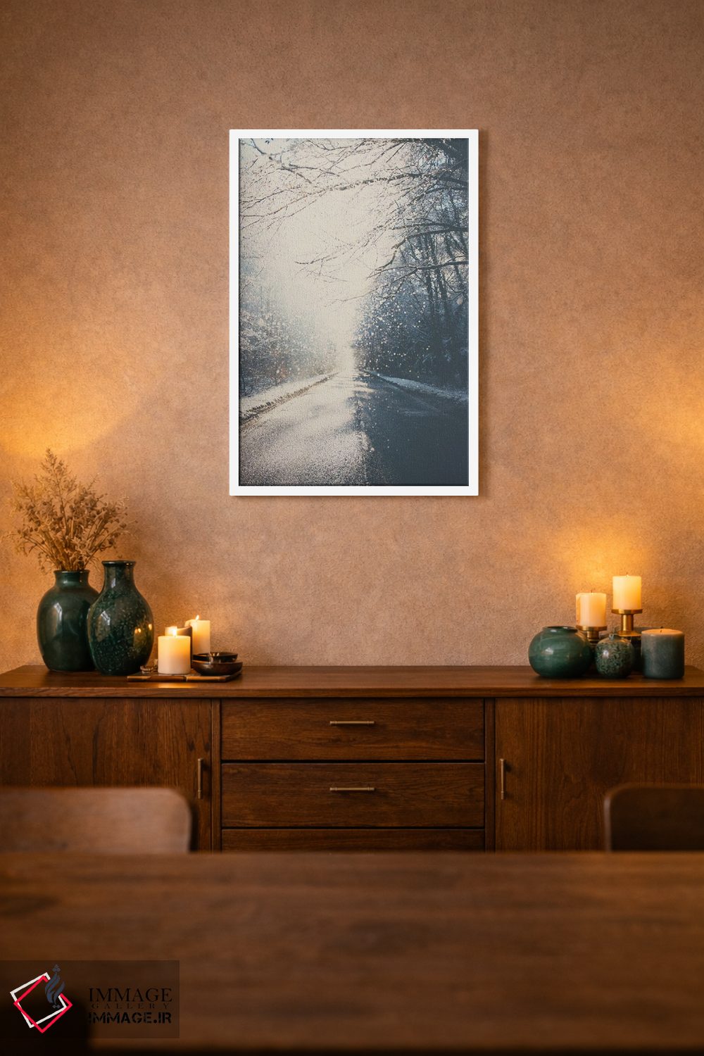 برای ترکیب با گلدانهای سبز، پارچههای ساده و نور گرم، «رانندگی به سوی خانه برای کریسمس» اثرِ «لورا ایوانز» با موضوعِ این اثر انتخابی هماهنگ است.