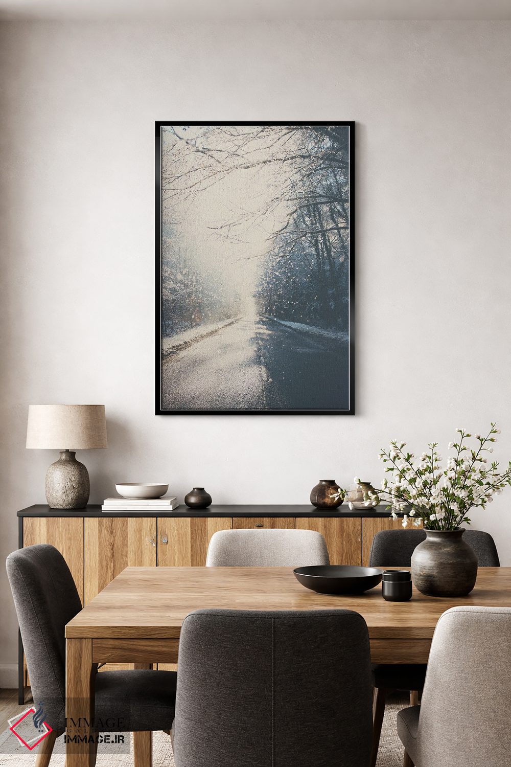 براساس پالت خنثی اثر، قاب مشکی مات (فریم باریک) پیشنهاد اول است و سفید مات (فریم باریک) مکمل. برای سفارشهای پروژهای با ابعاد و قابهای اختصاصی با ایماژ در تماس باشید.