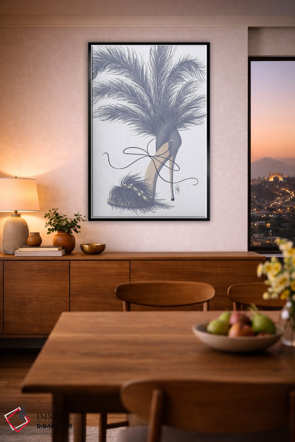 «کفش با پرهای یاسی» اثرِ «لا فَم ژوژو (نام هنری یا استودیو)» یک تکهی هنریِ خوشاستایل برای دیوارهای ساده است.