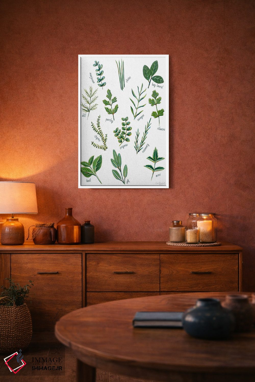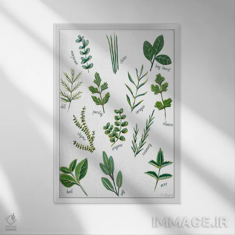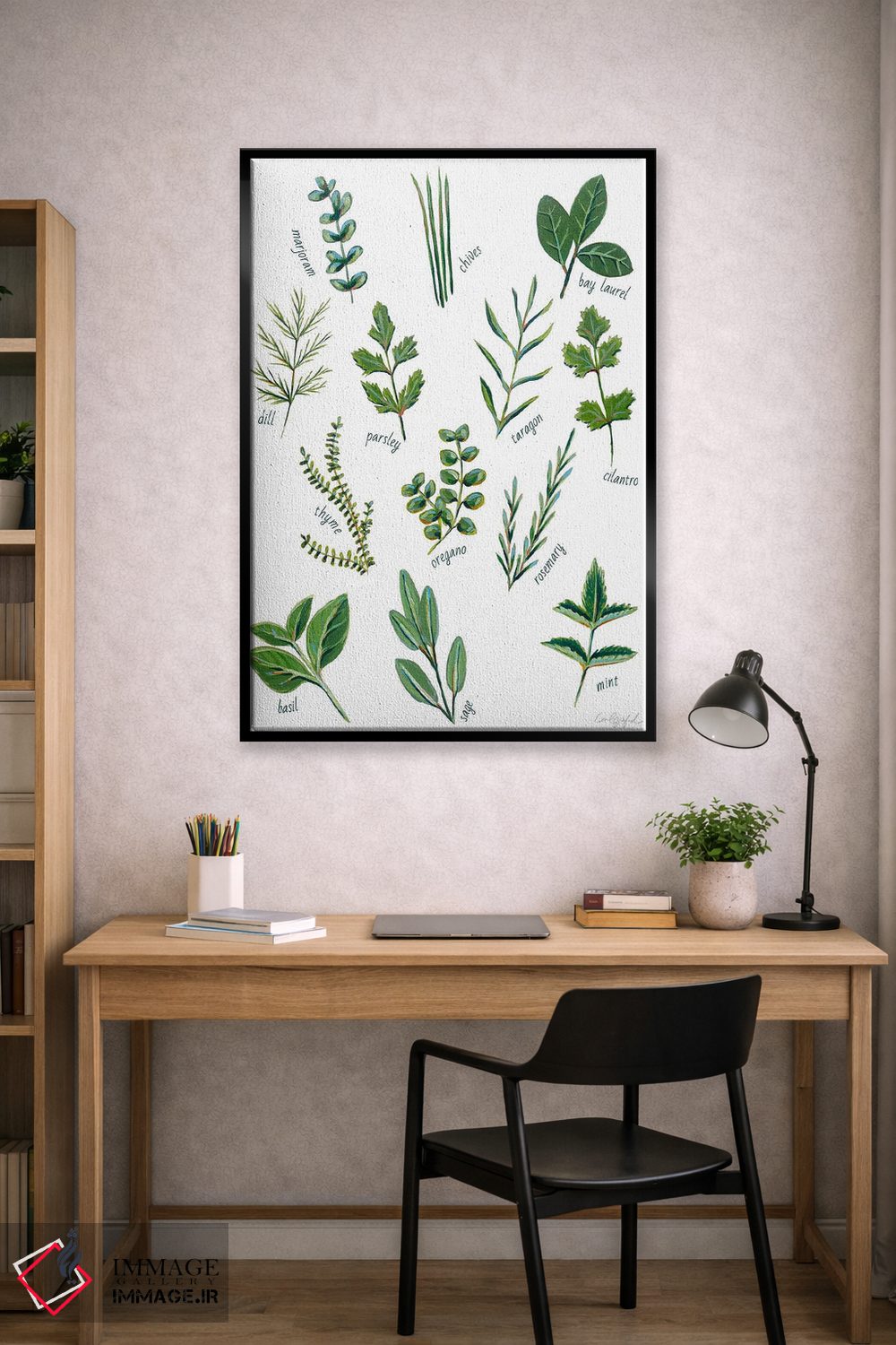 اگر دوست دارید دیوار روشنتر و آرامتر دیده شود، «سبزیجات معطر» اثرِ «لورِل گرینفیلد» فضا را نرمتر و مهماننوازتر میکند، برای کافهها و فضاهای آرام گزینهٔ مناسبیست. جزئیاتش از نزدیک هم ارزش تماشا دارد.