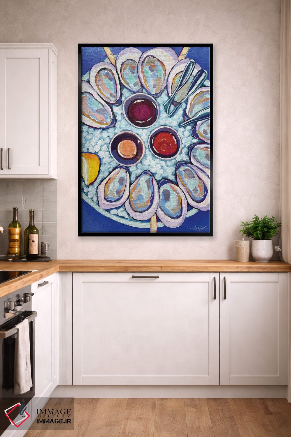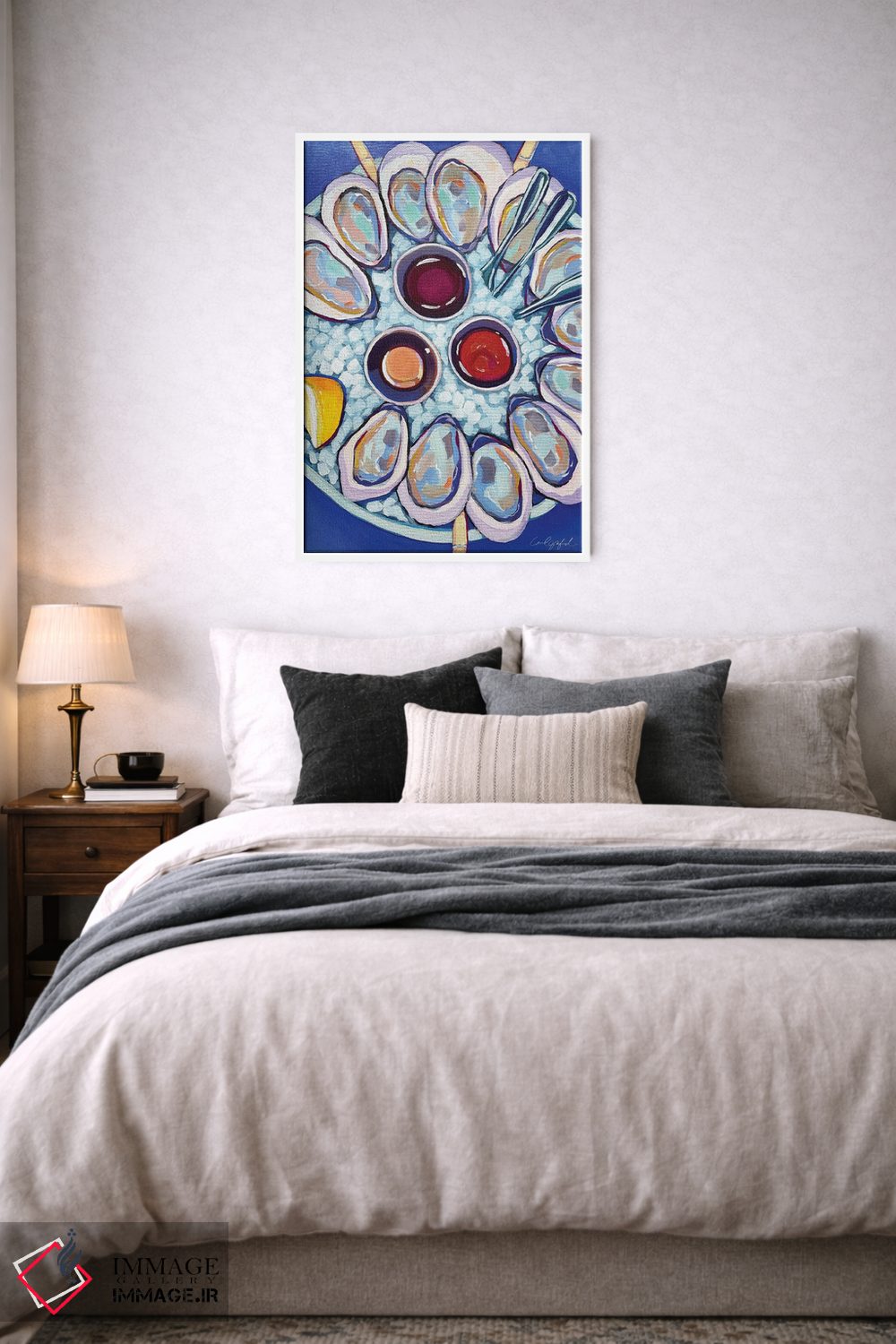 این تابلو با عنوان «صدفهای نیوانگلند» اثرِ «لورِل گرینفیلد»، حسِ گرم و صمیمی به فضا میدهد.