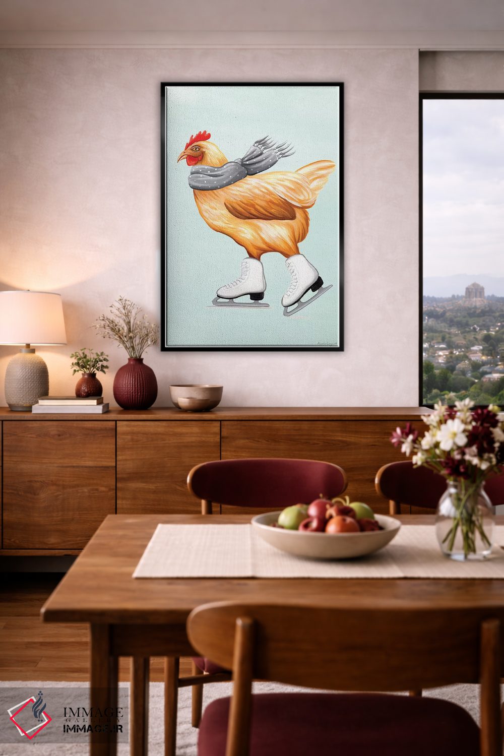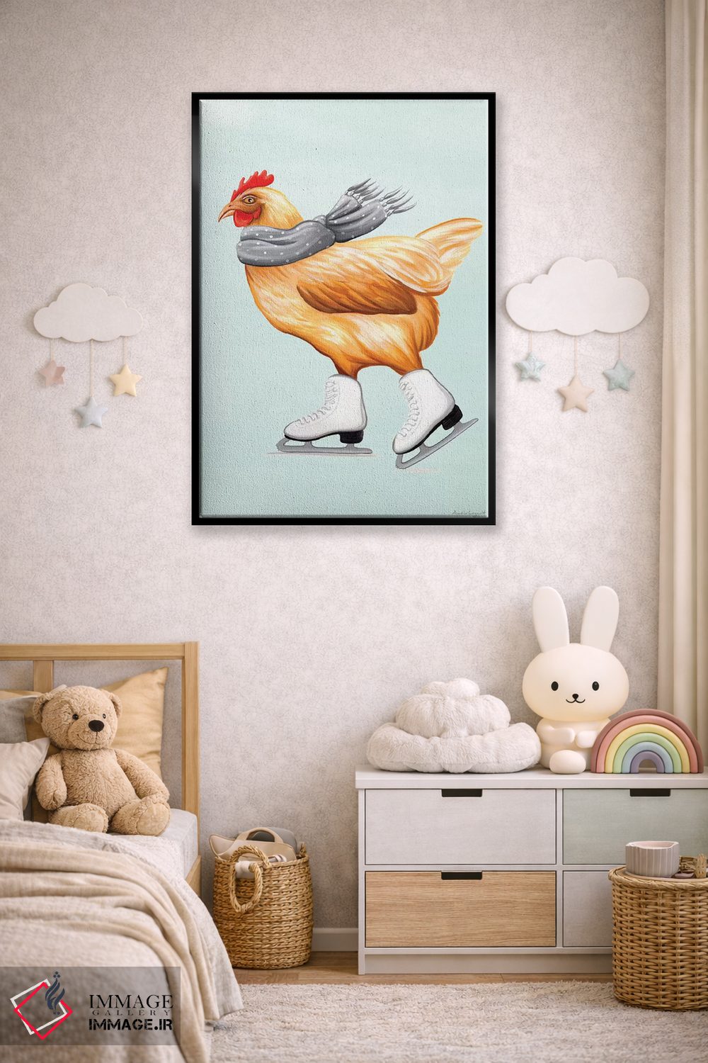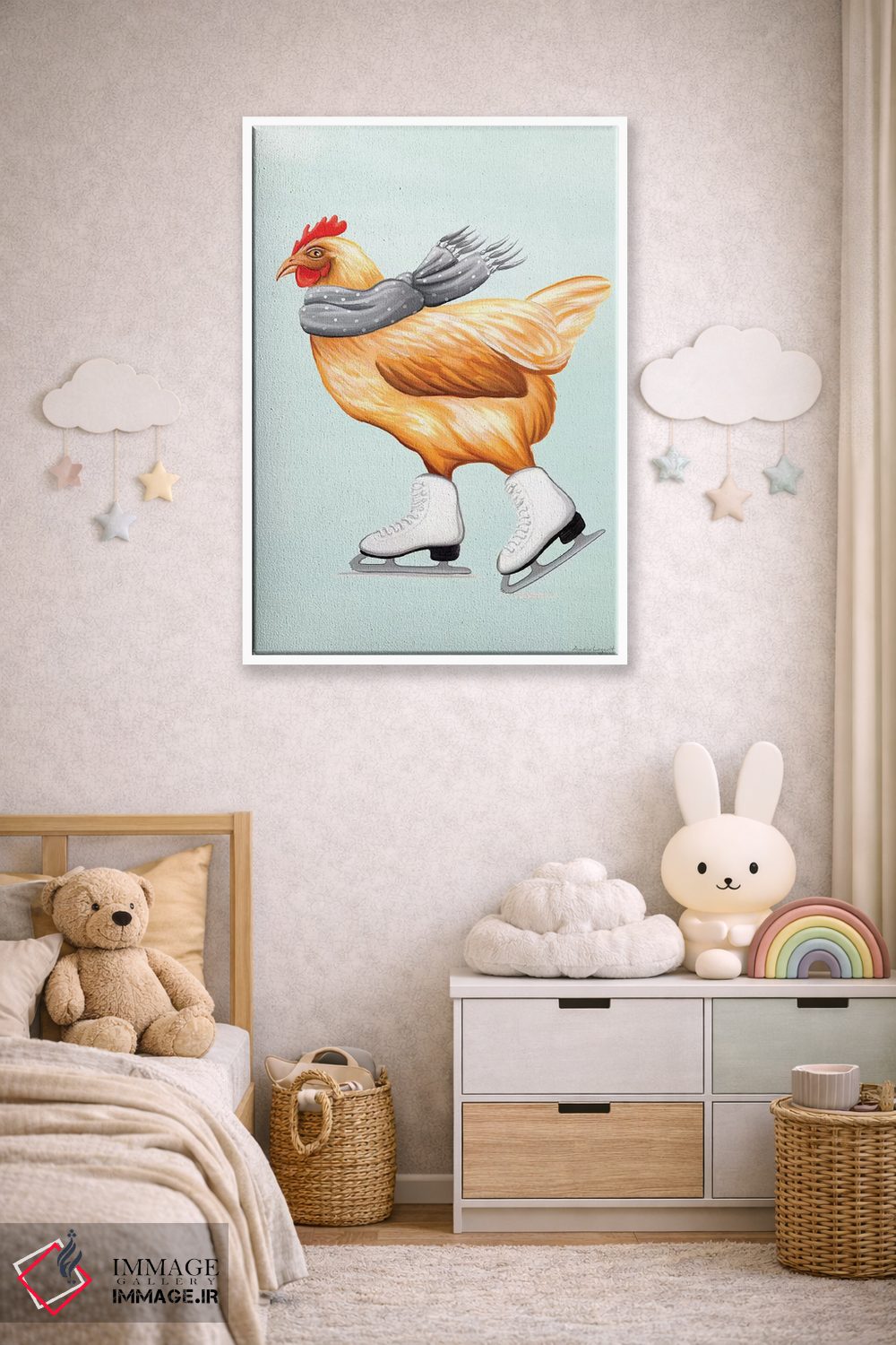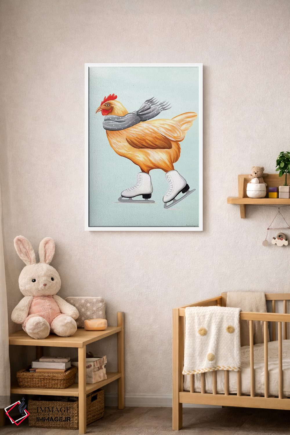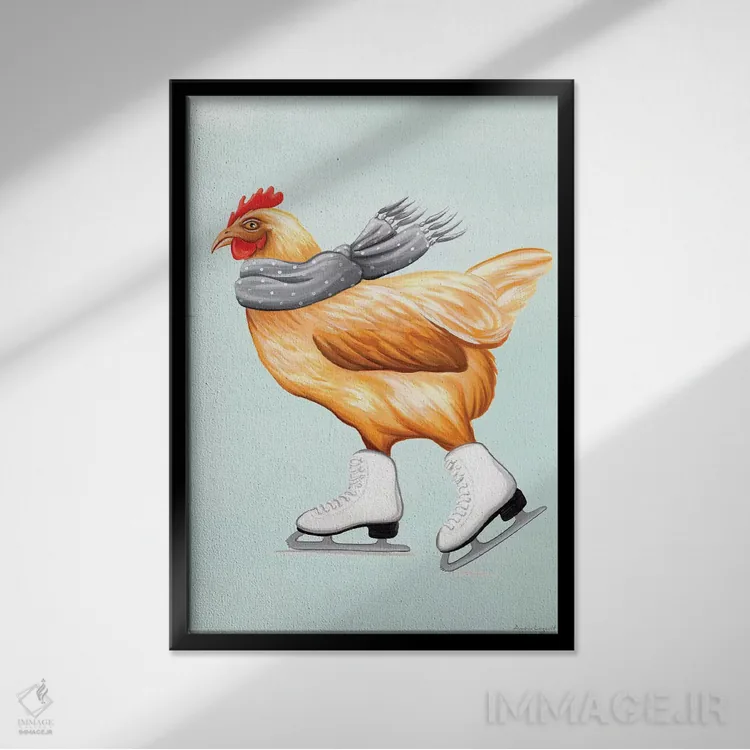 برای اتاقی که به یک عنصر دوستداشتنی نیاز دارد، «مرغ با اسکیت روی یخ» اثرِ «آملی لگو (Amelie Legault)» یک لبخند ریز به چیدمان میدهد؛ برای دیوار کنار میز کار انتخابی خوشسلیقه است. هم فضا را گرم میکند، هم شلوغش نمیکند.