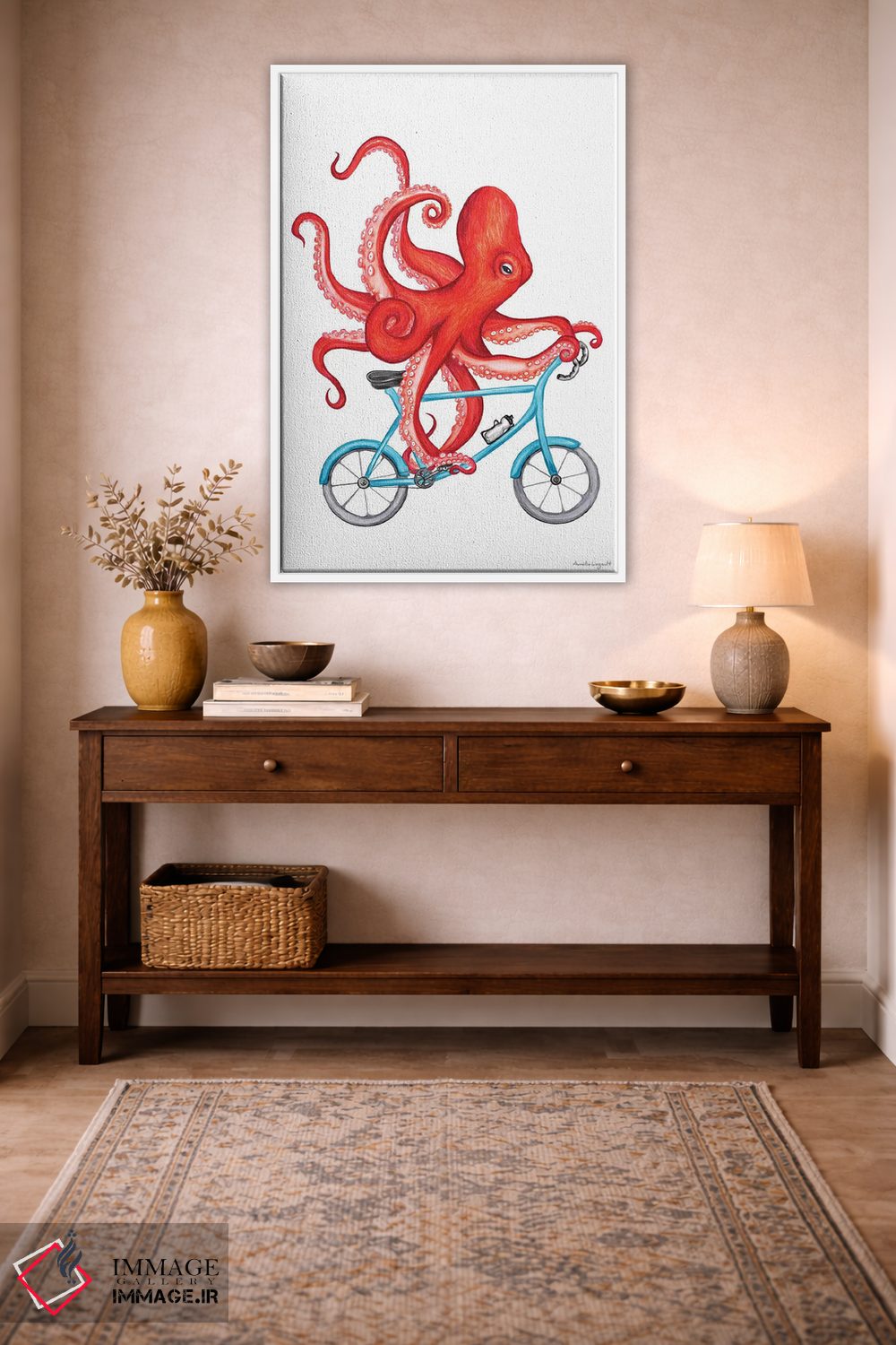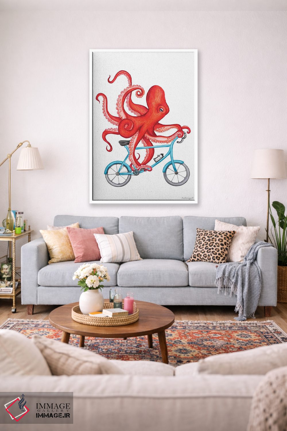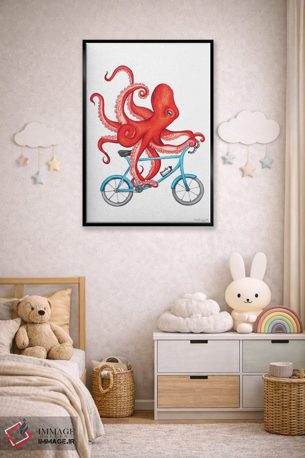 «هشتپا روی دوچرخه» اثرِ «آملی لگو (Amelie Legault)» میتواند بدون کودکانه شدن، بازیگوش و خوشپرداخت میماند؛ برای اتاق بازی یا گوشهٔ مطالعه پیشنهاد شود. برای دیوار گالریوار هم گزینهٔ خوبیست.