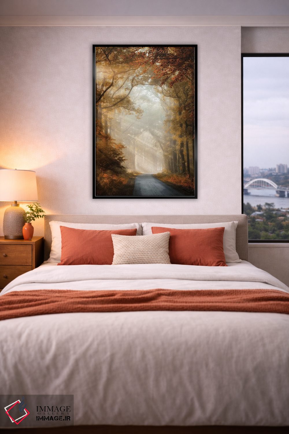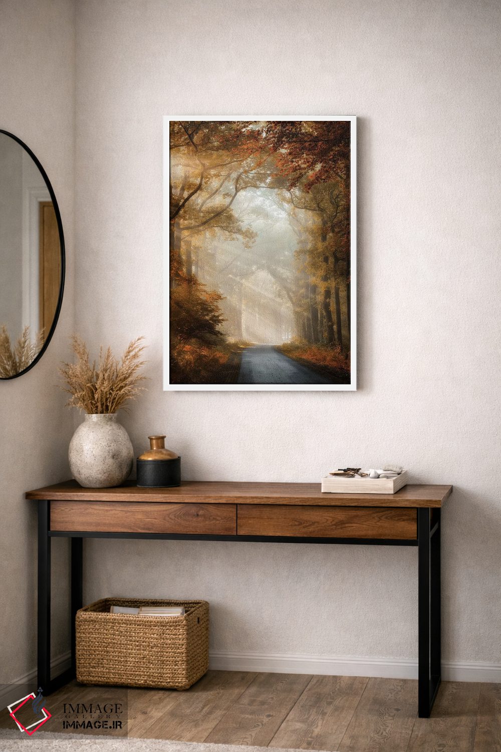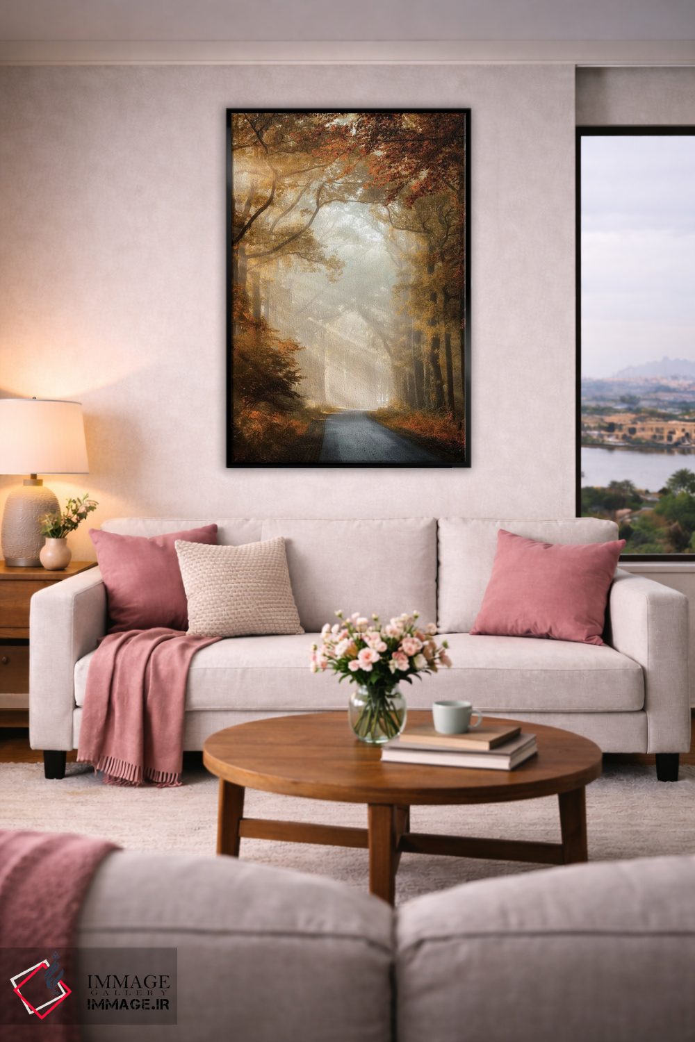 براساس پالت گرم اثر، قاب بلوط روشن (چوبی) پیشنهاد اول است و استخوانی ملایم مکمل. برای سفارشهای پروژهای با ابعاد و قابهای اختصاصی با ایماژ در تماس باشید.