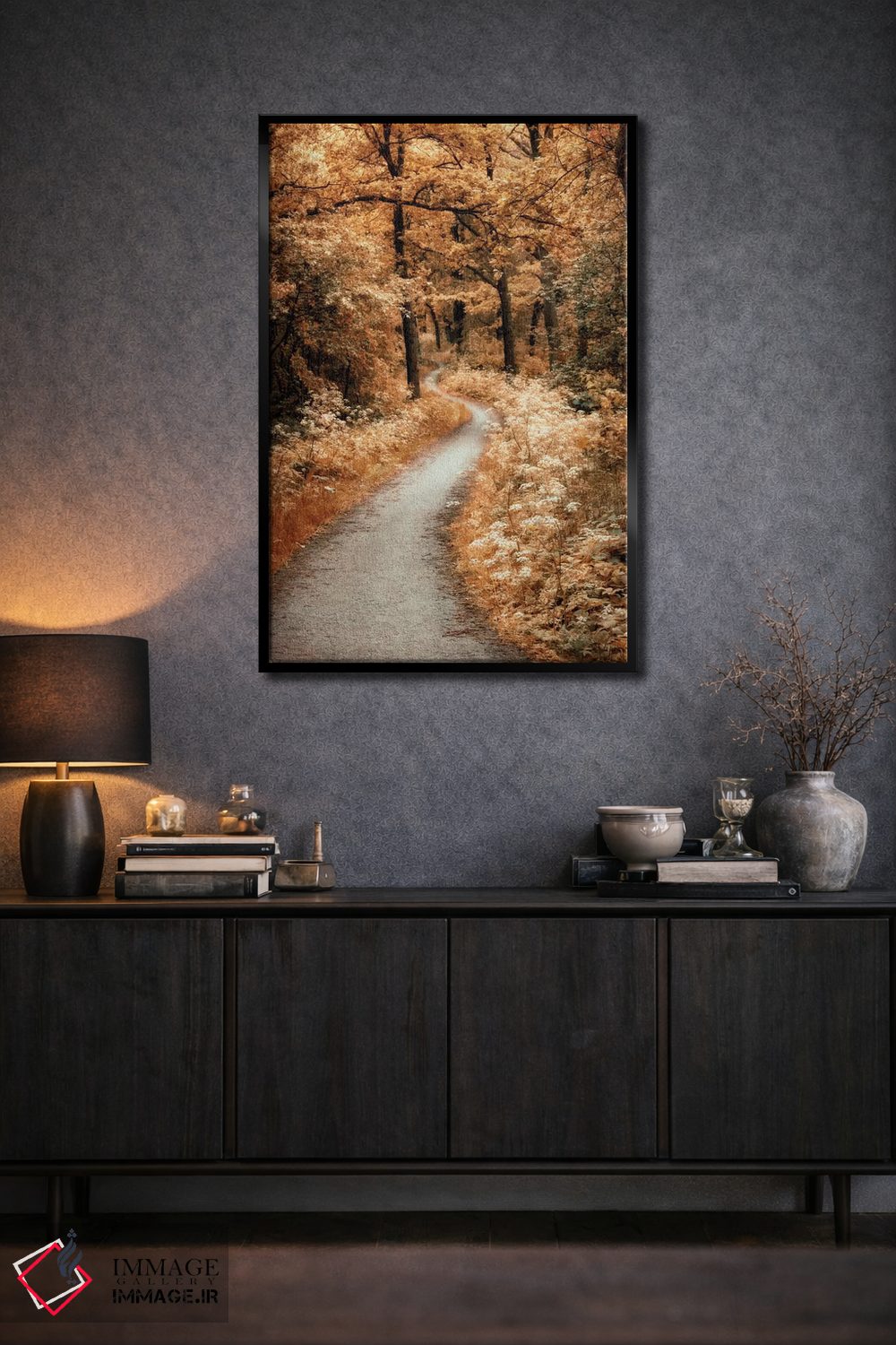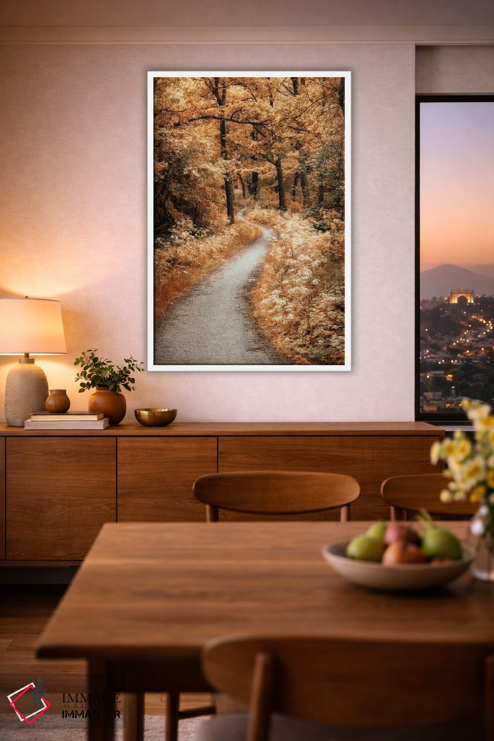 براساس پالت گرم اثر، قاب بلوط روشن (چوبی) پیشنهاد اول است و استخوانی ملایم مکمل. برای سفارشهای پروژهای با ابعاد و قابهای اختصاصی با ایماژ در تماس باشید.