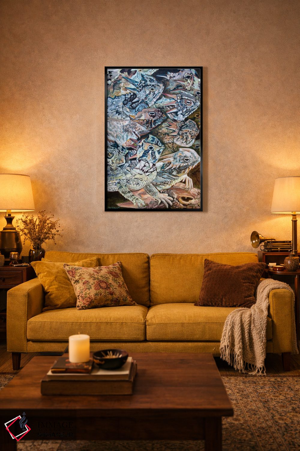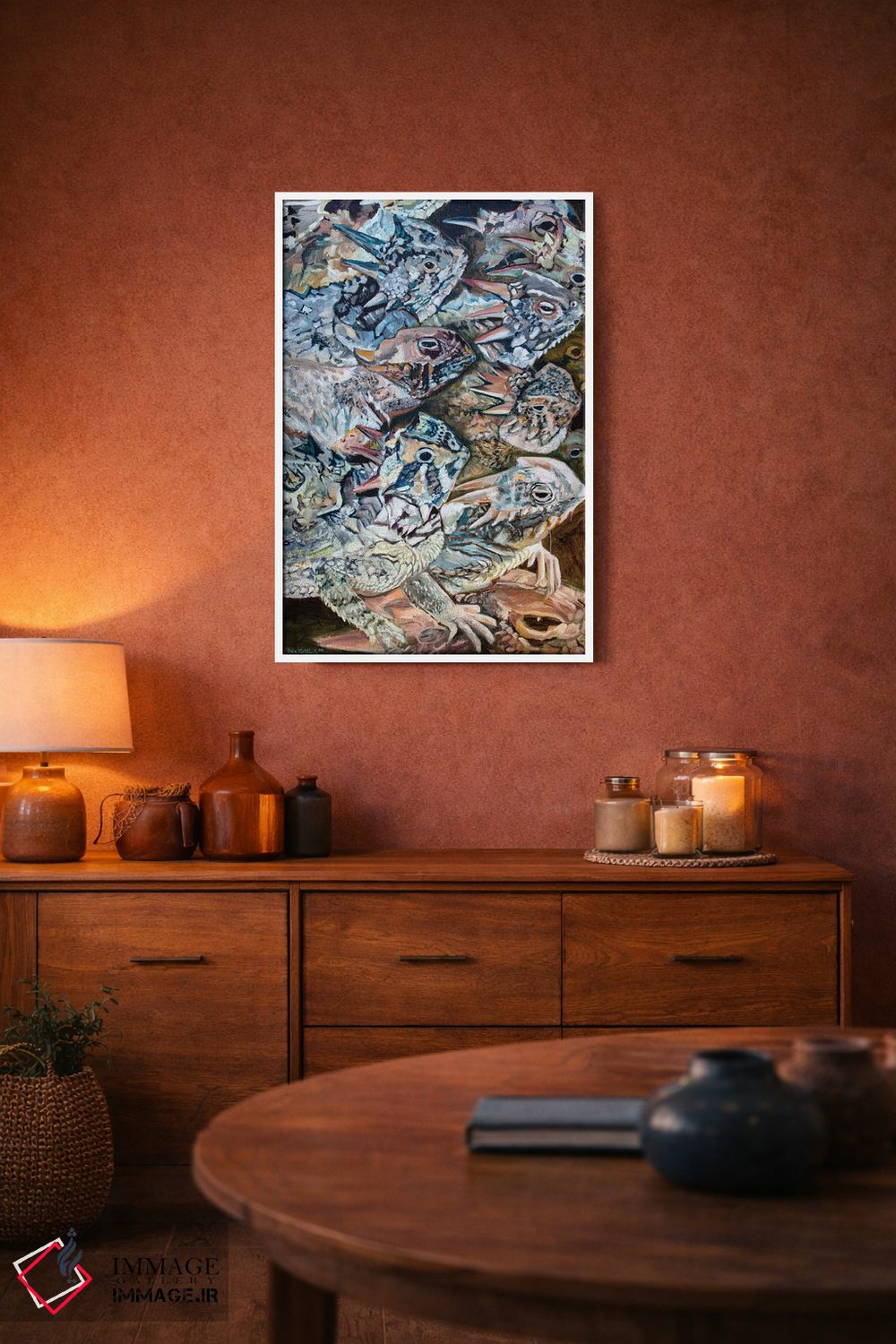 برای دکورهای صمیمی، «تهاجم مارمولکهای شاخدار» اثرِ «لیزا گلدفارب» در کنار رنگهای خنثی، تضاد دلچسبی میسازد؛ برای اتاق کودک (بدون لحن کودکانه) انتخابی خوشسلیقه است. برای دیوار گالریوار هم گزینهٔ خوبیست.