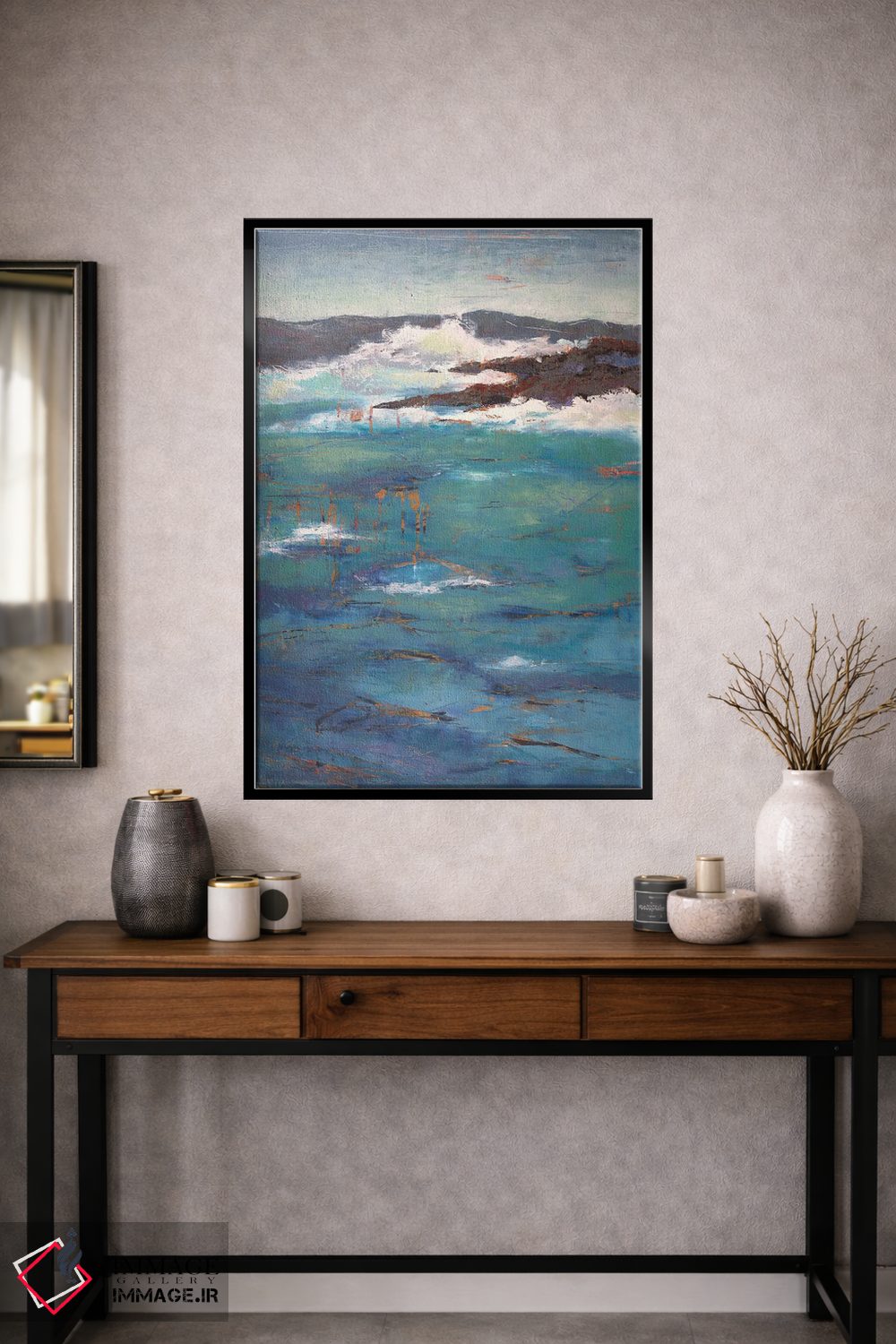 براساس پالت ترکیبی اثر، قاب تیک گرم (چوبی) پیشنهاد اول است و مشکی مات (فریم متوسط) مکمل. برای سفارشهای پروژهای با ابعاد و قابهای اختصاصی با ایماژ در تماس باشید.