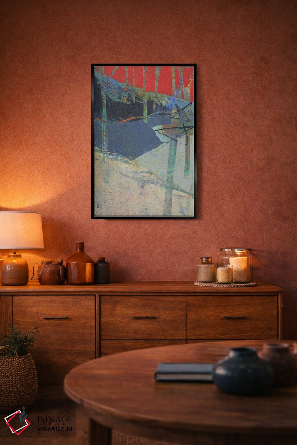 براساس پالت ترکیبی اثر، قاب تیک گرم (چوبی) پیشنهاد اول است و مشکی مات (فریم متوسط) مکمل. برای سفارشهای پروژهای با ابعاد و قابهای اختصاصی با ایماژ در تماس باشید.